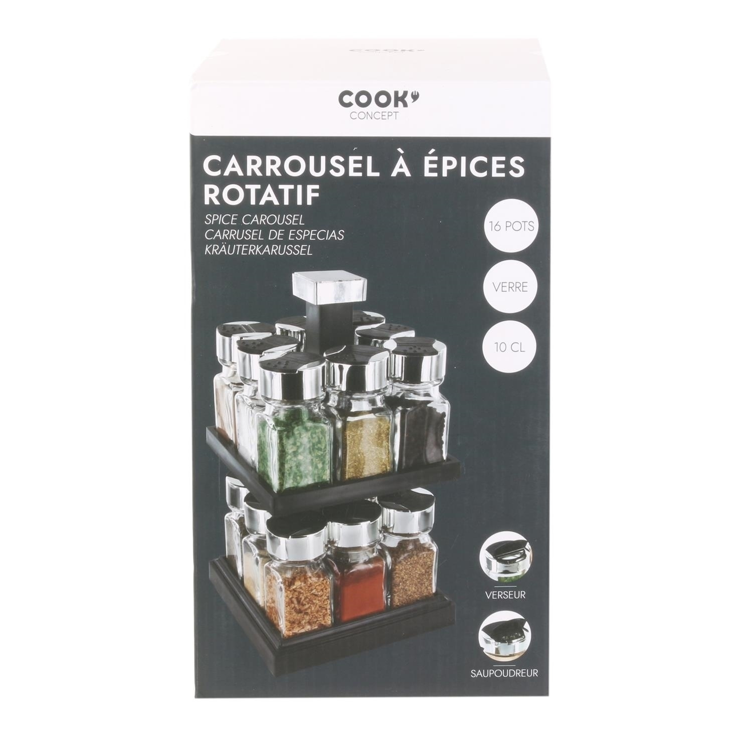 Ten kwadratowy, obrotowy pojemnik na przyprawy jest zaprojektowany na 2 poziomach i wyposażony w 16 szklanych słoików, które okażą się niezwykle praktyczne w kuchni! Możesz napełnić je różnymi przyprawami, aby wzbogacić swoje pyszne potrawy o aromatyczne nuty. Zestaw jest łatwy do przenoszenia dzięki podstawie, która ułatwia jego przesuwanie. Pojemność pojemników: 100 mlCechy produktu