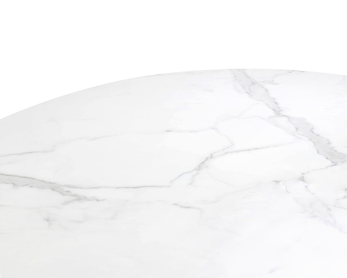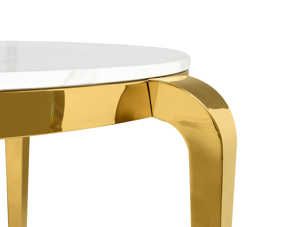 Stół MAISON 130X150 biały. Połączenie wyrafinowanego stylu i współczesnego designu. Stabilna podstawa ze stali, wykończona w luksusowym, złotym odcieniu, dodaje całości blasku i wytworności. Okrągły blat wykonany z konglomeratu imitującego marmur zachwyca subtelnym rysunkiem kamienia i nadaje wnętrzu ponadczasowy charakter. Doskonale wpisuje się w aranżacje nowoczesnych i ekskluzywnych salonów, jadalni czy przestrzeni reprezentacyjnych. Świetnie komponuje się ze stylem modern glam, łącząc nowoczesną elegancję z luksusowym wykończeniem. Zachwyca nie tylko formą, ale również podkreśla wyjątkowy design każdego wnętrza. Wymiary: wys. 75,5 cm / szer. 150 cm / gł. 150 cm Blat: śr. 130 cm / gr. 1,5 cm Podstawa: 107 cm x 107 cm Sposób wysyłki: paleta.Cechy produktu