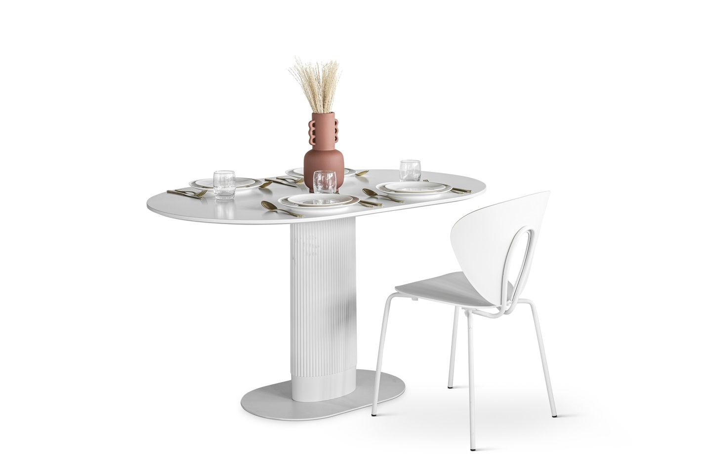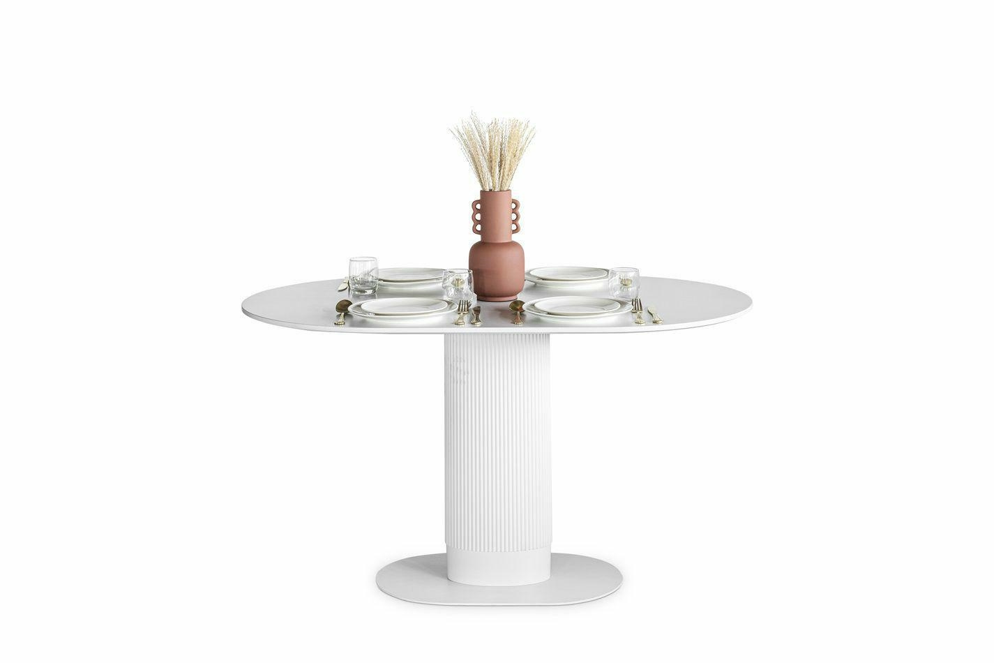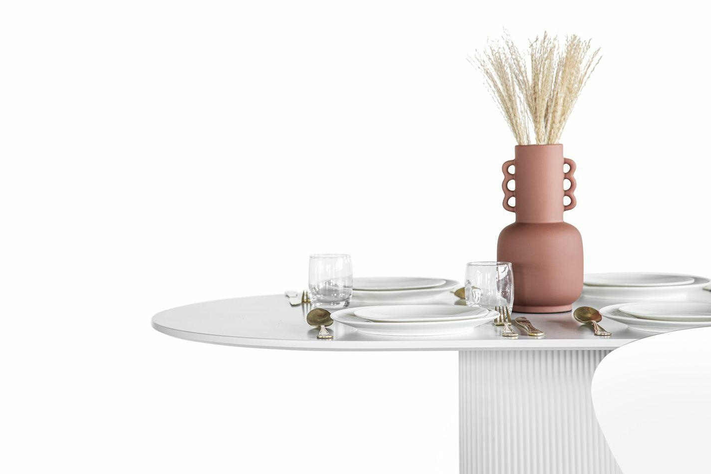 Stół Maxim to nowoczesny projekt o ponadczasowym wyglądzie. Owalny blat o szerokości 120cm i głębokości 70cm jest idealną powierzchnią dla 5-6 osób. Stół na jednej nodze wykonany został z płyty MDF oraz metalowej podstawy. Noga stołu wykonana z metalu ozdobiona została pionowymi lamelami z tworzywa sztucznego, które dodają jej nowoczesnego wyglądu. Płaska podstawa stołu to metal malowany proszkowo na czarno. Blat stołu wykonany z wytrzymałej płyty MDF zachwyca swoim wyglądem, dzięki delikatnemu podcięciu, które dodaje mu lekkości. Stół występuje w dwóch wersjach kolorystycznych. Wymaga montażu Waga stołu: 25,6 kgCechy produktu
