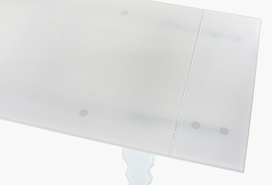 Blat i falowane nogi stołu wykonane zostały ze szkła. Blat i nogi wykonane są ze szkła OPTI WHITE, hartowanego, fazowanego, polerowanego i szlifowanego na krawędziach. Blat oraz nogi lakierowane od spodu na kolor biały RAL 9003 Wymiary: wys. 78,5 cm / szer. 200- 300 cm / gł. 100 cm Blat: gr. 10 mm Rozstaw nóg: szer. 145 cm / gr. 20 mm Waga netto: 120 kg Sposób wysyłki: paleta.Cechy produktu