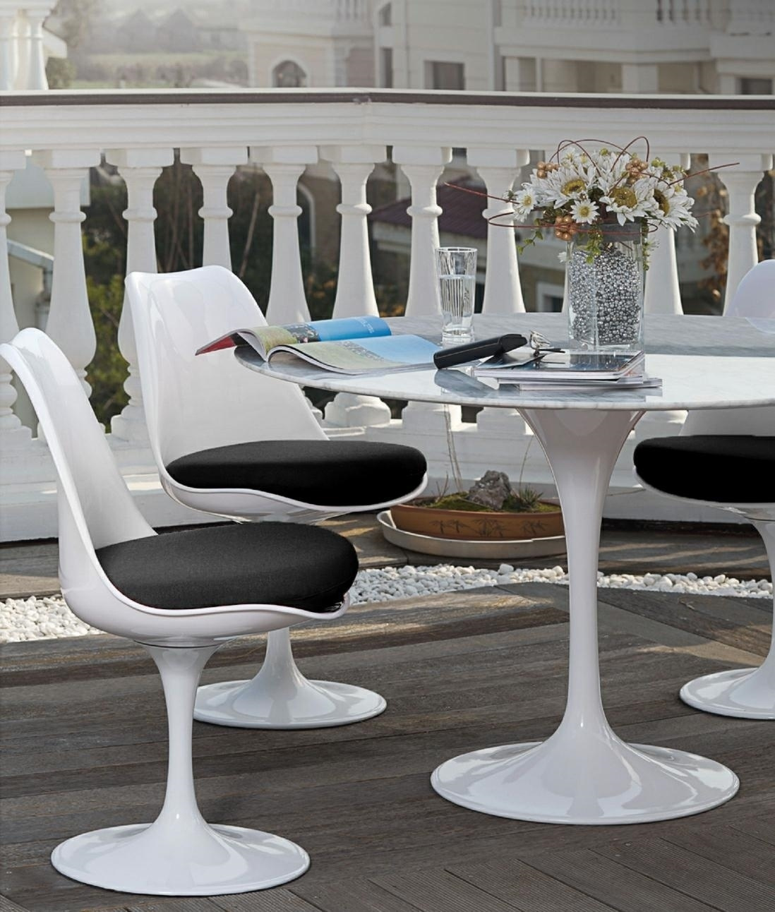 - Stół Tulip Marble o średnicy 120 cm. Blat okragły wykonany został z włoskiego marmuru Bianco Carrara w jasnym kolorze. Noga wykonana z metalu lakierowanego proszkowo na kolor biały połysk. Dopełnieniem stołu, są fotele i krzesła z kolekcji Tulip. Całość t