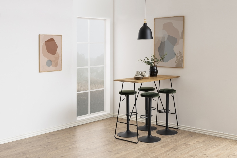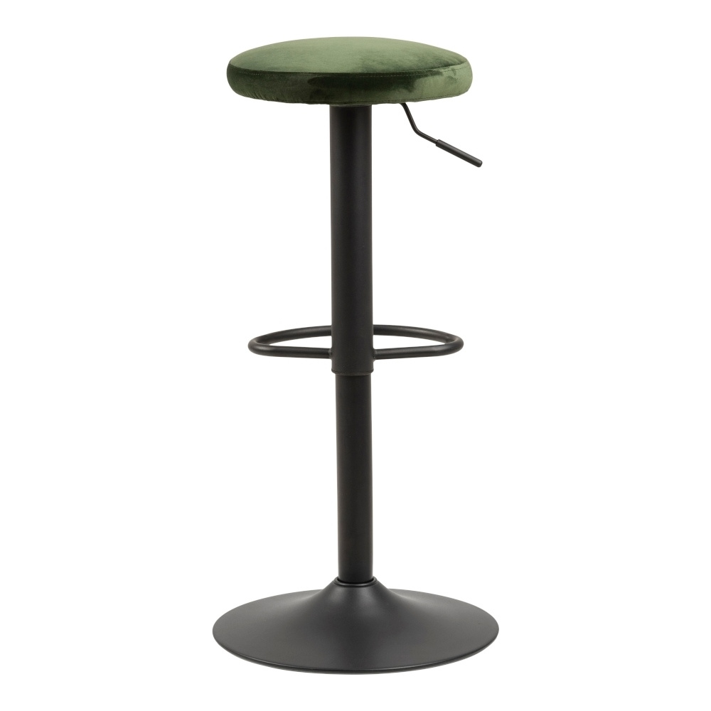 - Stołek barowy Finch będzie idealnym siedziskiem przy kuchennej wyspie. Na metalowej, pomalowanej proszkowo na kolor czarny stopie, znajduje się siedzisko, które dla wygody obszyte zostało tkaniną VIC fabric forest zielony 68AC. Siedzisko wyposażono w mech