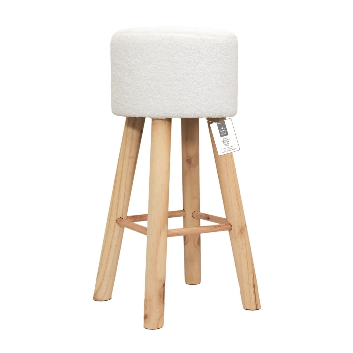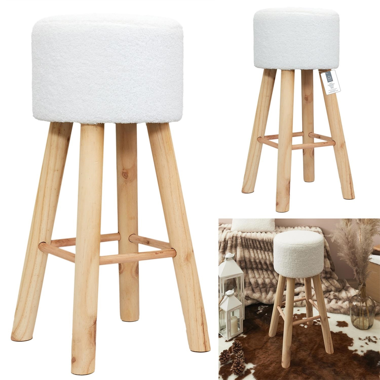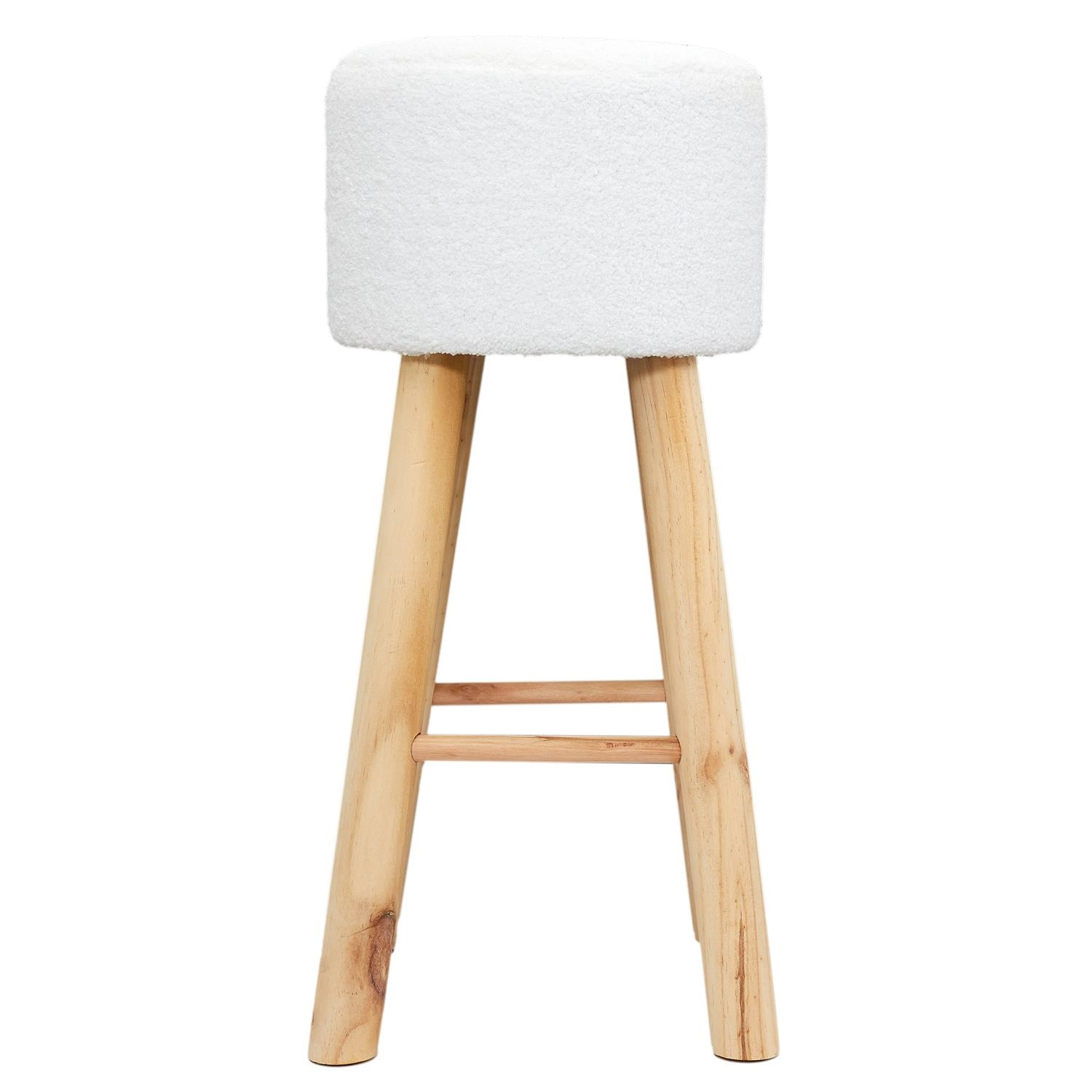 - Stołek barowy w stylu boho z drewnianymi sosnowymi nogami oraz białym siedziskiem z miękkiej, grubo plecionej tkaniny zachwyci osoby lubiące otaczać się meblami nawiązującymi swoim wyglądem do natury. Wysoki stołek posiada siedzisko w kształcie walca o śr