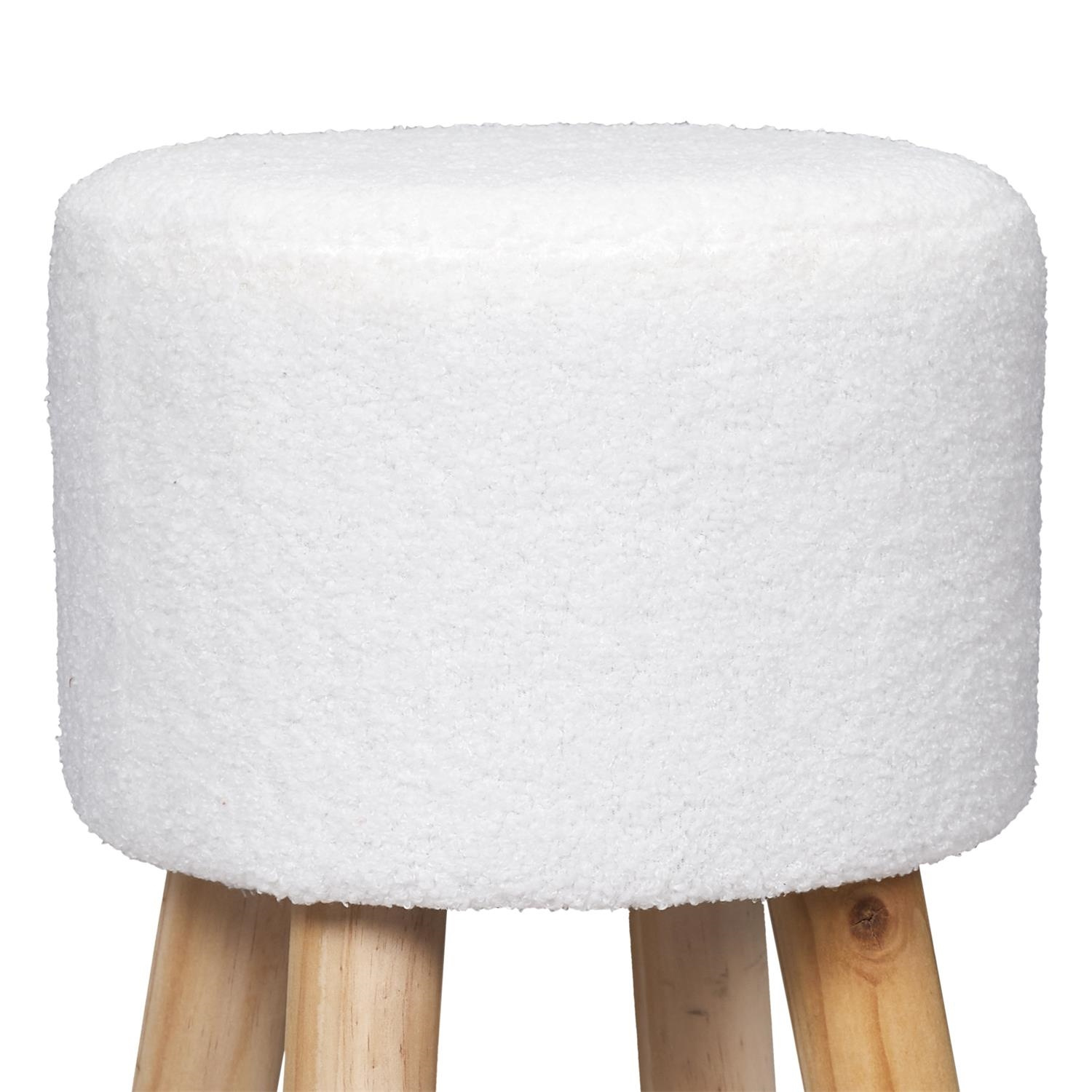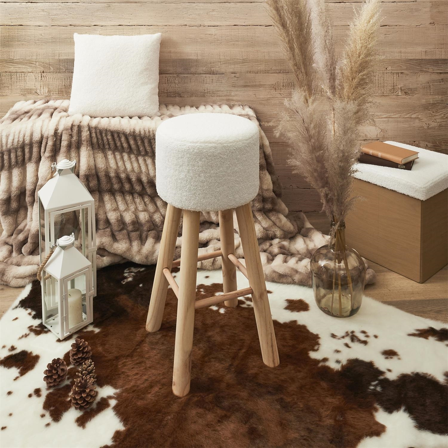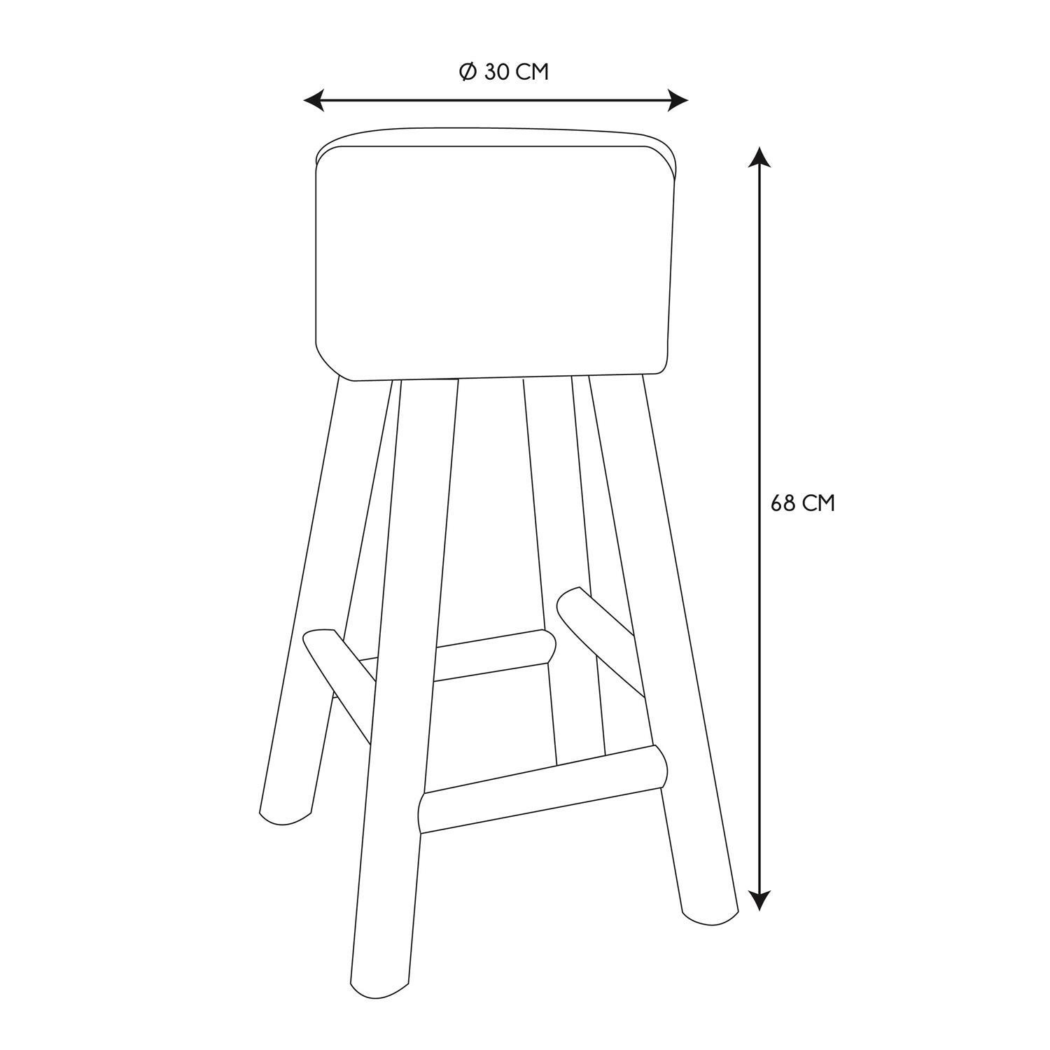- Stołek barowy w stylu boho z drewnianymi sosnowymi nogami oraz białym siedziskiem z miękkiej, grubo plecionej tkaniny zachwyci osoby lubiące otaczać się meblami nawiązującymi swoim wyglądem do natury. Wysoki stołek posiada siedzisko w kształcie walca o śr