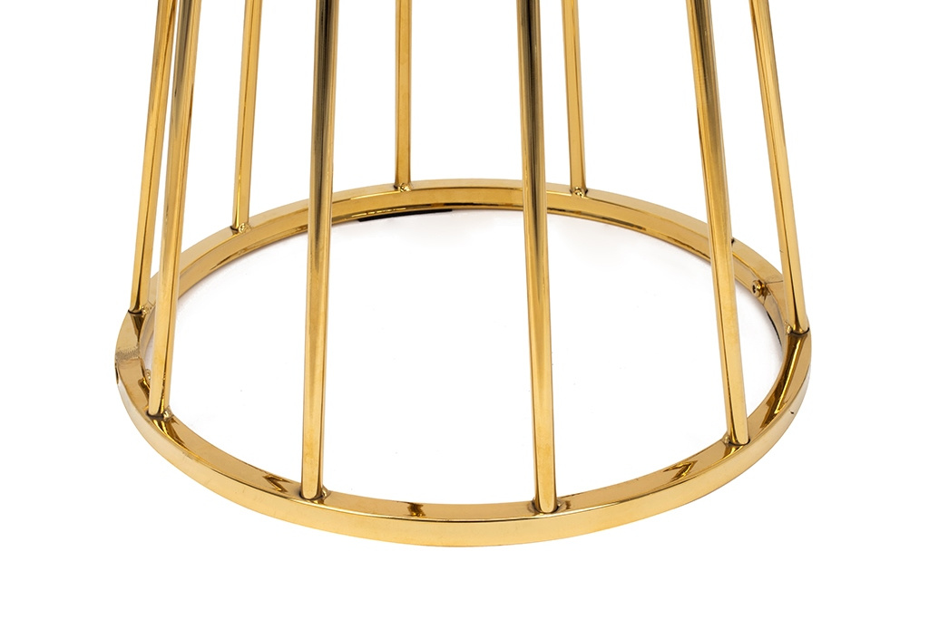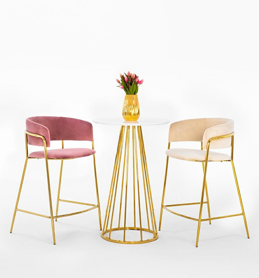Stolik barowy GLAM 60 biały. Nowoczesna forma w stylu glamour łączy subtelny blask ze stylowym minimalizmem. Okrągły blat wykonany z płyty MDF lakierowanej na biały matowy kolor zachwyca prostotą i elegancją. Stabilna podstawa z metalowych, chromowanych poprzeczek w odcieniu złota dodaje całości luksusowego charakteru. Doskonale odnajdzie się w nowoczesnych wnętrzach, wprowadzając do nich szyk i ponadczasowy urok. Odkryj całą kolekcję Glam i znajdź wariant, który najlepiej podkreśli charakter oraz styl Twojej przestrzeni. Wymiary: wys. 90 cm / szer. 60 cm / gł. 60 cm Blat: gr. 2 cm Podstawa: śr. 44 cm.Cechy produktu