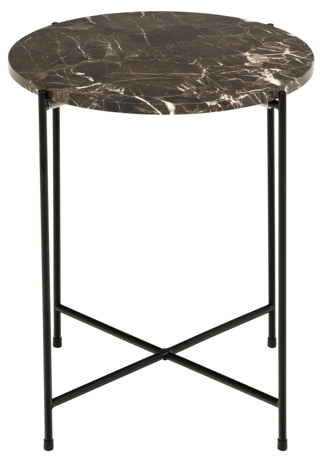 - Stolik kawowy Avila to niewielki, elegancki mebel idealny do salonu w stylu glamour. Posiada okrągły blat z brązowego marmuru oraz malowaną proszkowo podstawę złożoną z czterech nóg w kolorze czarnym. Nogi stolika zabezpieczone są nakładkami z tworzywa sz