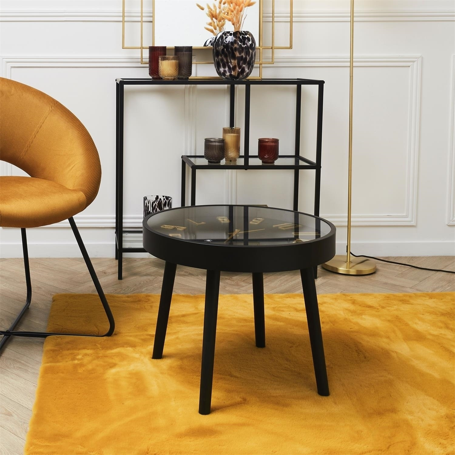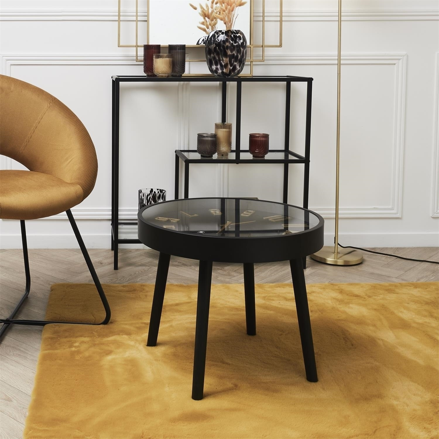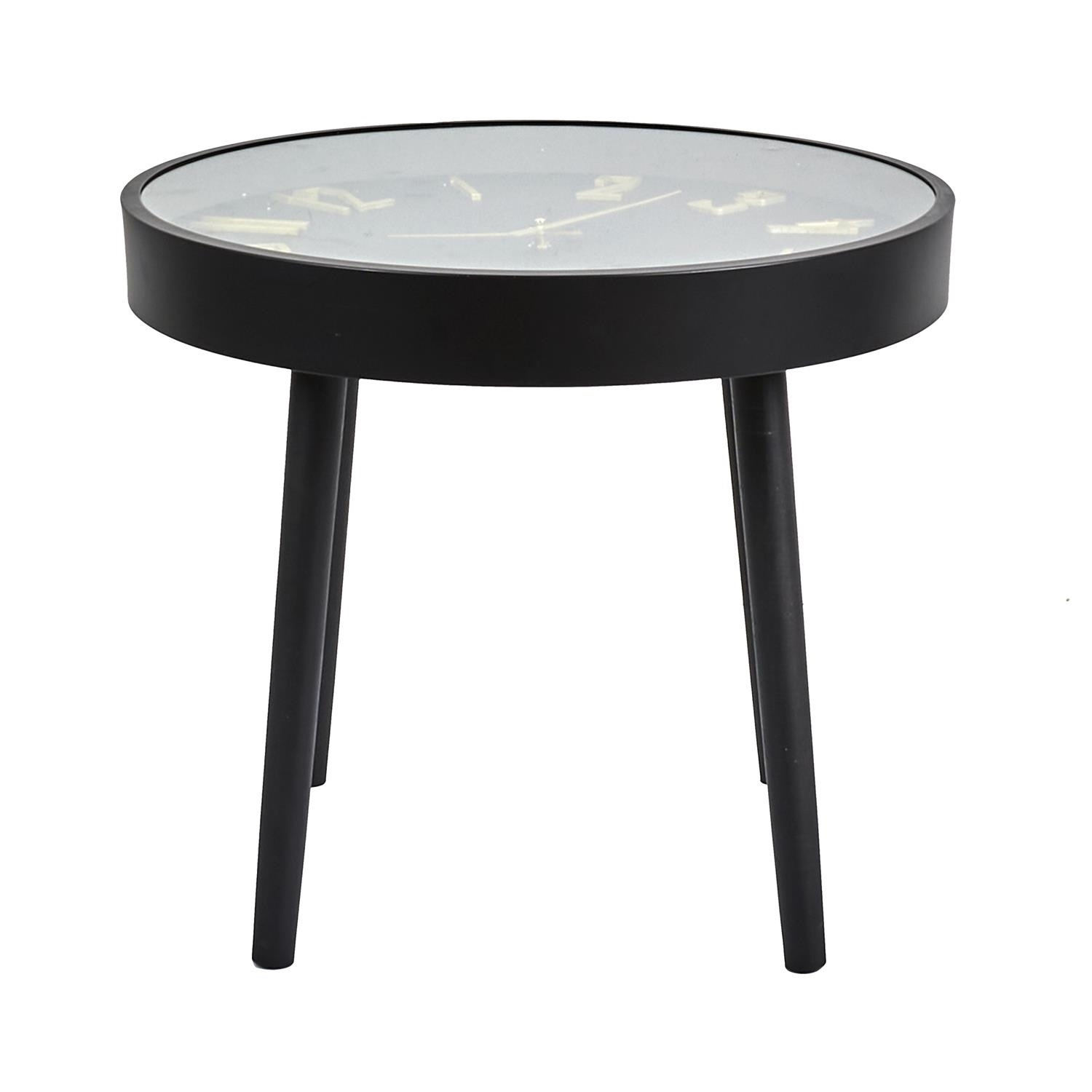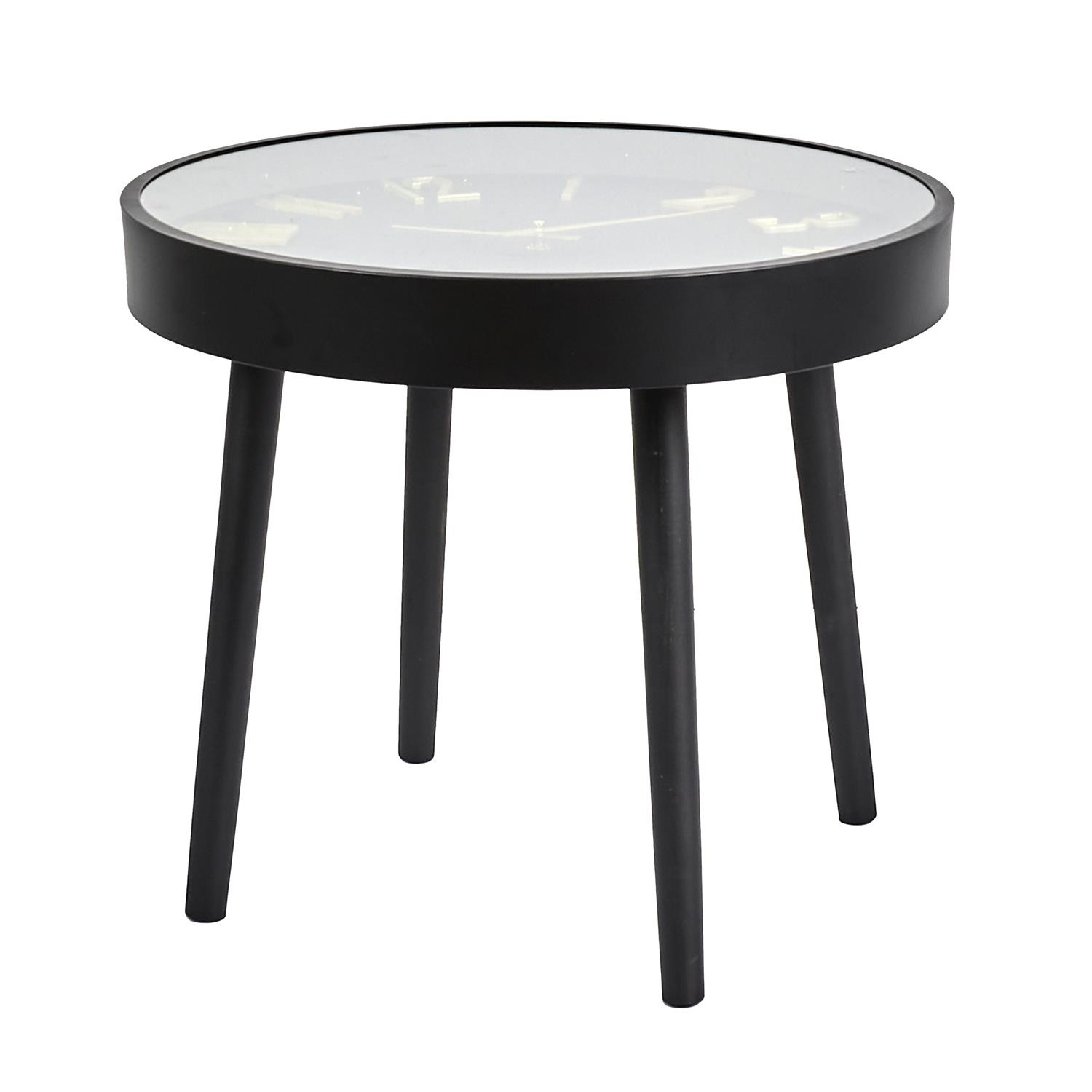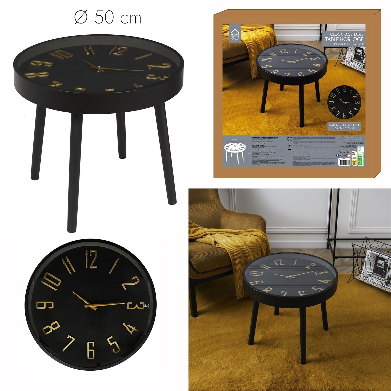 Okrągły stolik w którym blatem jest tarcza zegara to zarówno elegancki jak i nietypowy mebel. Czarny stolik wykonany został z drewnianych, sosnowych nóg, Metalowej ramy blatu, szklanego blatu pod którym jest tarcza zegara. Sama tarcza to połączenie płyty MDF oraz metalowych wskazówek. Na baterie (brak w zestawie): R6-AA Wymaga montażu (przykręcenia nóg do blatu) Wymiary kartonu: 52x52x12 cm, Waga: 5kgCechy produktu