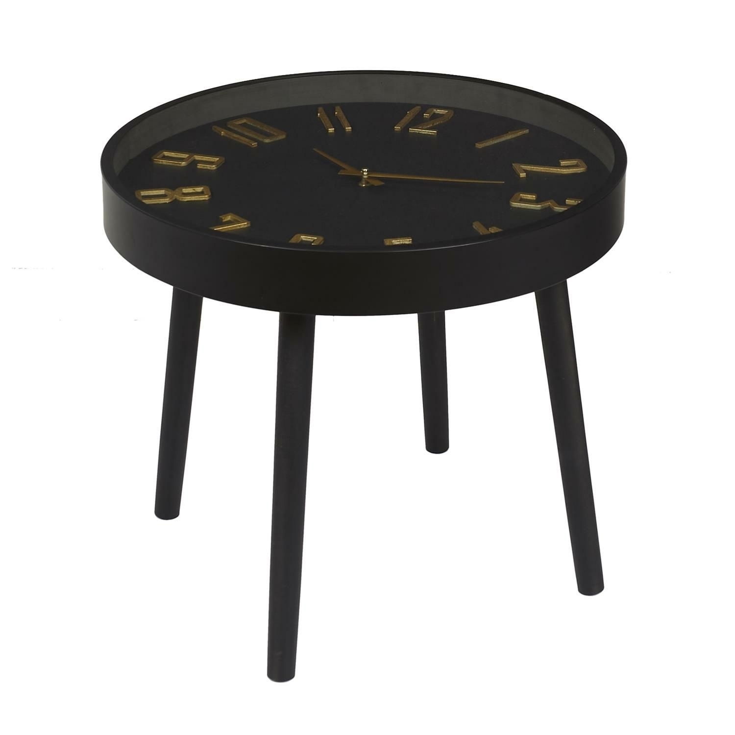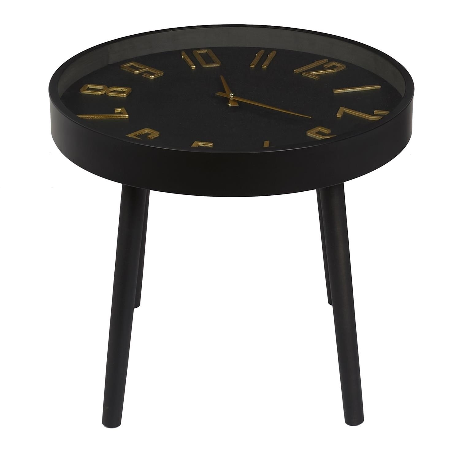 - Okrągły stolik w którym blatem jest tarcza zegara to zarówno elegancki jak i nietypowy mebel. Czarny stolik wykonany został z drewnianych, sosnowych nóg, Metalowej ramy blatu, szklanego blatu pod którym jest tarcza zegara. Sama tarcza to połączenie płyty