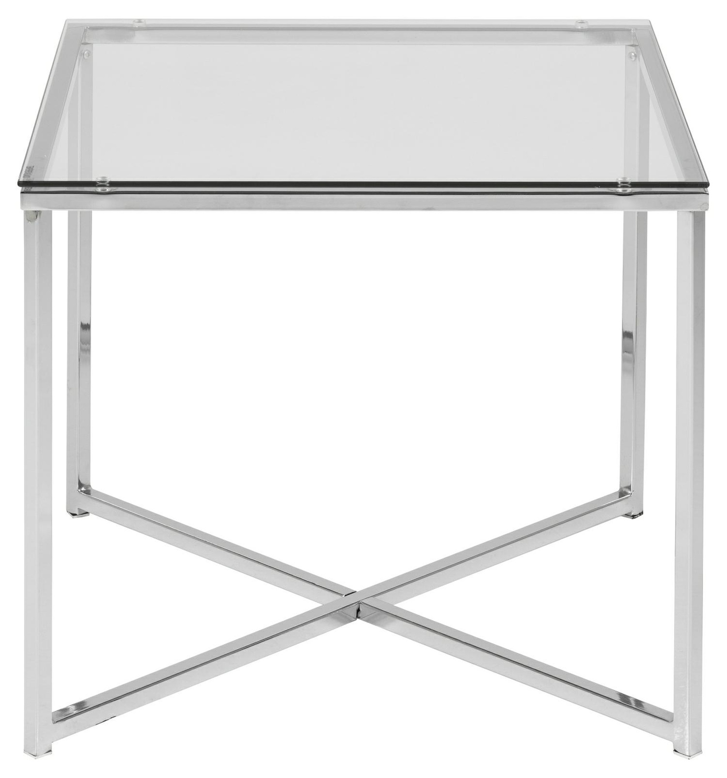 Stolik kwadratowy Cross wykonany zostal z chromowanego metalu oraz transparentnego szkła hartowanego, stanowiącego taflę blatu. Stolik doskonale odnajdzie się w industrialnych, loftowych oraz nowoczesnych wnętrzach wnosząć elegancję i styl. Stolik wymaga montażu, maksymalne obciążenie wynosi 30kg, nie nadaje się na zewnątrz. Sprawdzi się w przestrzeniach komercyjnych, biurowych, hotelowych oraz domowych.Cechy produktu