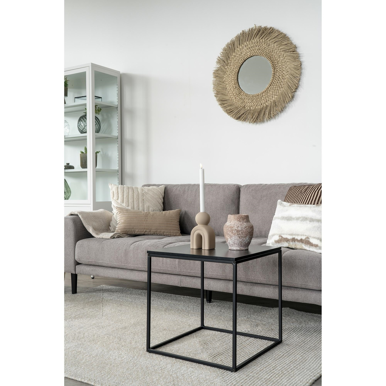 Stolik pomocniczy Vita sprawdzi się jako dodatkowy stolik przy sofie lub jako stolik pod kwiata. Stolik Vita wykonany został z metalu malowanego proszkowo na czarno oraz blatu z płyty wiórewej ozdobionej okleiną imitującą słoje drewna. Stolik Vita to element minimalistycznej kolekcji Vita. Wymaga montażu Wymiary kartonu: 48,5x47,5x5cm Waga: 4kgCechy produktu