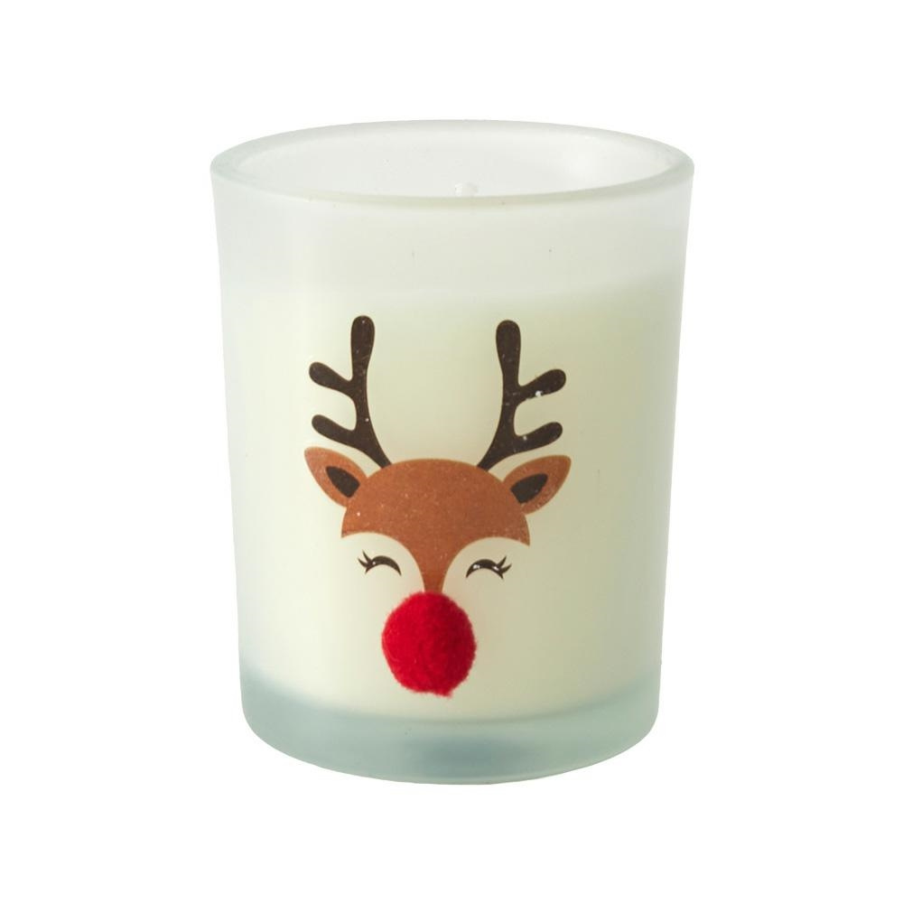 Świąteczna świeczka o świątecznym zapachu. Świeca zapachowa w półprzezroczystym szklanym świeczniku. Szkło świecy wygląda jak zaszronione, co dodaje jej świątecznego uroku. Świąteczny motyw postaci z ozdobnym filcowym pomponem . Zapachy dostępne do wyboru: biały: choinka, czerwony: cynamon lub zielony: wanilia , Bawełniany knot, parafina Czas palenia: 8 godzin. Wymiary: 5x5x6 cm Waga 45 g.Cechy produktu