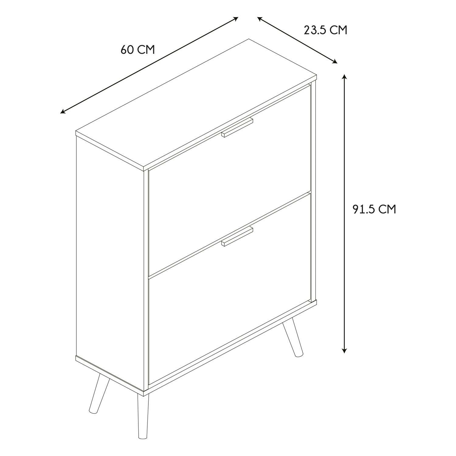 Płytka szafka na buty w kolorze białym i frontach w okleinie drewnianej to dwudrzwiowy mebel, który pomoże w uporządkowaniu obuwia w przedpokoju. Szafka o głębokości 23,5 cm to idealny mebel do małego przedpokoju. Szafka posiada dwa fronty, które się uchylają. Do frontów zamontowane zostały specjalne półki na buty. Szafka została zrobiona z płyty MDF, która jest wytrzymała i z pewnością posłyży nam przez wele lat. Biała szafka na buty to idealny mebel do jasnej kawalerki lub wnętrza w stylu skandynawskim. Wysokość nóżek 16 cm.Cechy produktu