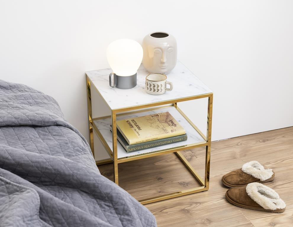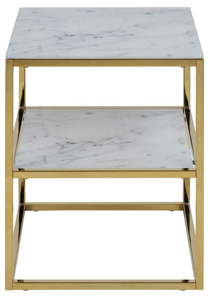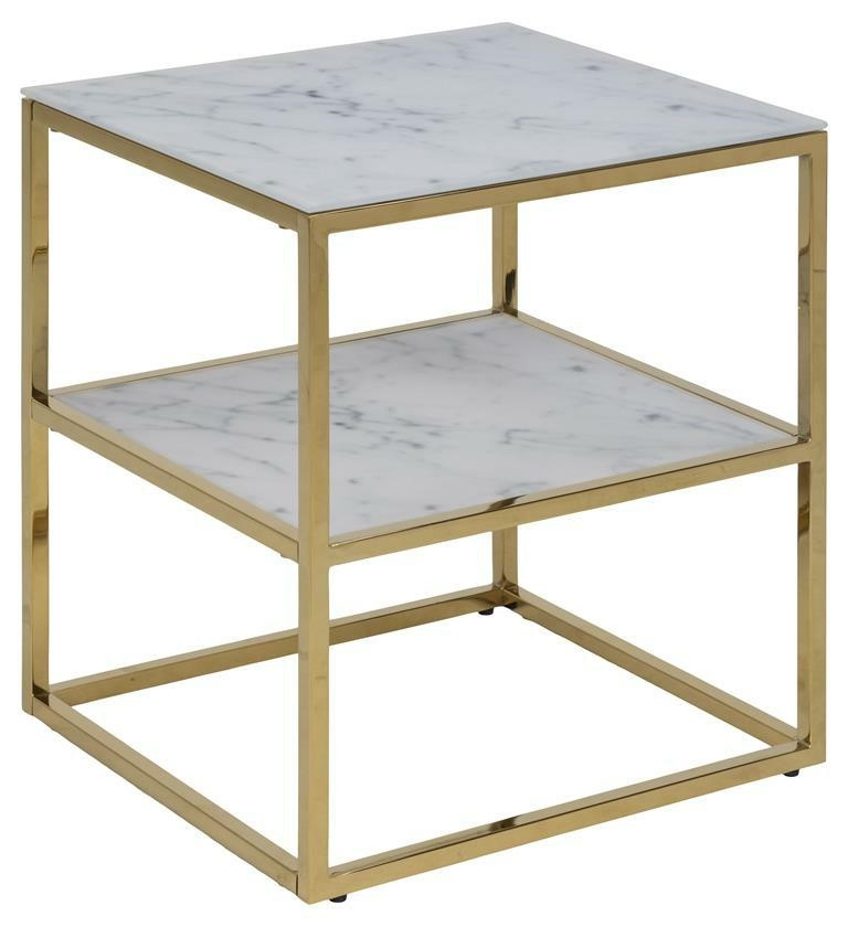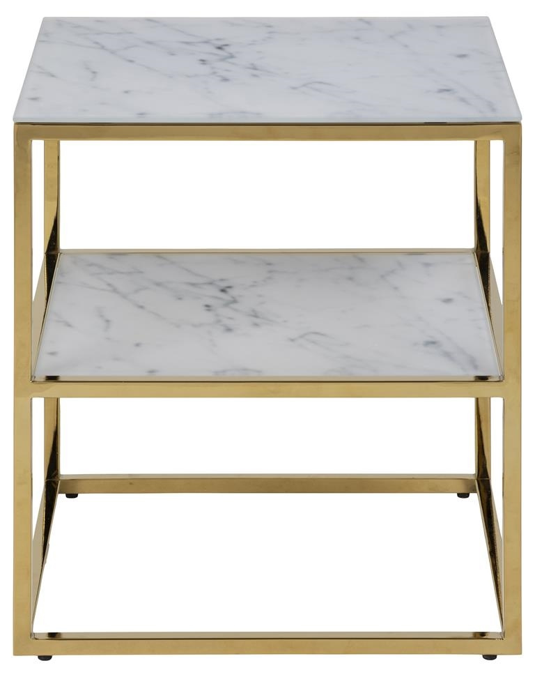 - Szafka nocna Alisma w ponadczasowym stylu glamour. Posiada szkielet z chromowanego metalu w kolorze złotym oraz kwadratowy blat i półkę ze szkła pokryte wzorem imitującym biały marmur. Od spodu szafka została zabezpieczona nakładkami z tworzywa. Szafka ni
