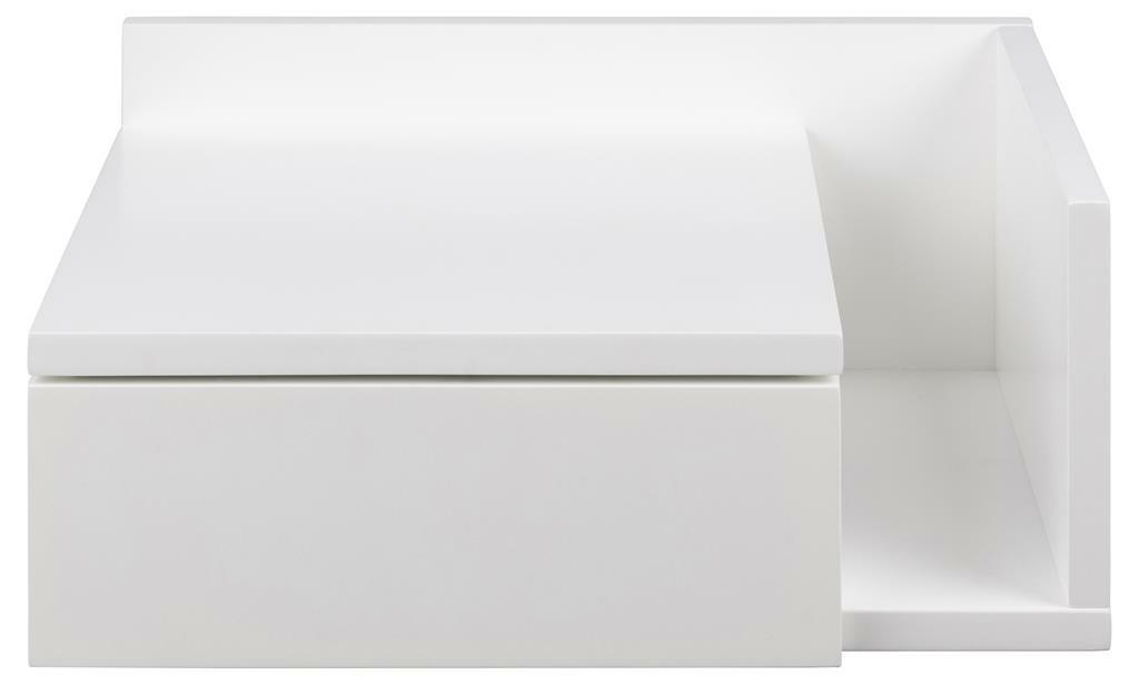 Szafka Ashlan doskonale nada się jako szafka nocna. Jej minimalistyczny kształt i geometria sprawiają że doskonale odnajdzie się w nowoczesnej sypialni, ale również salonie. Szafka wykonana została z płyty MDF. Szafkę Ashlan można postawić koło łóżka, ale również bez mniejszego problemu powiesić na ścianie. Szuflada pomieści drobne przedmioty a przestrzeń między blatami sprawdzi się jako półka na książki czy ulubioną gazetę. Szafka oprócz szuflady posiada także niewielką boczną półkę. Ilość kartonów: 1 Wymiary kartonów: 45,8x34,5x9cm Waga kartonów: 6,1kgCechy produktu