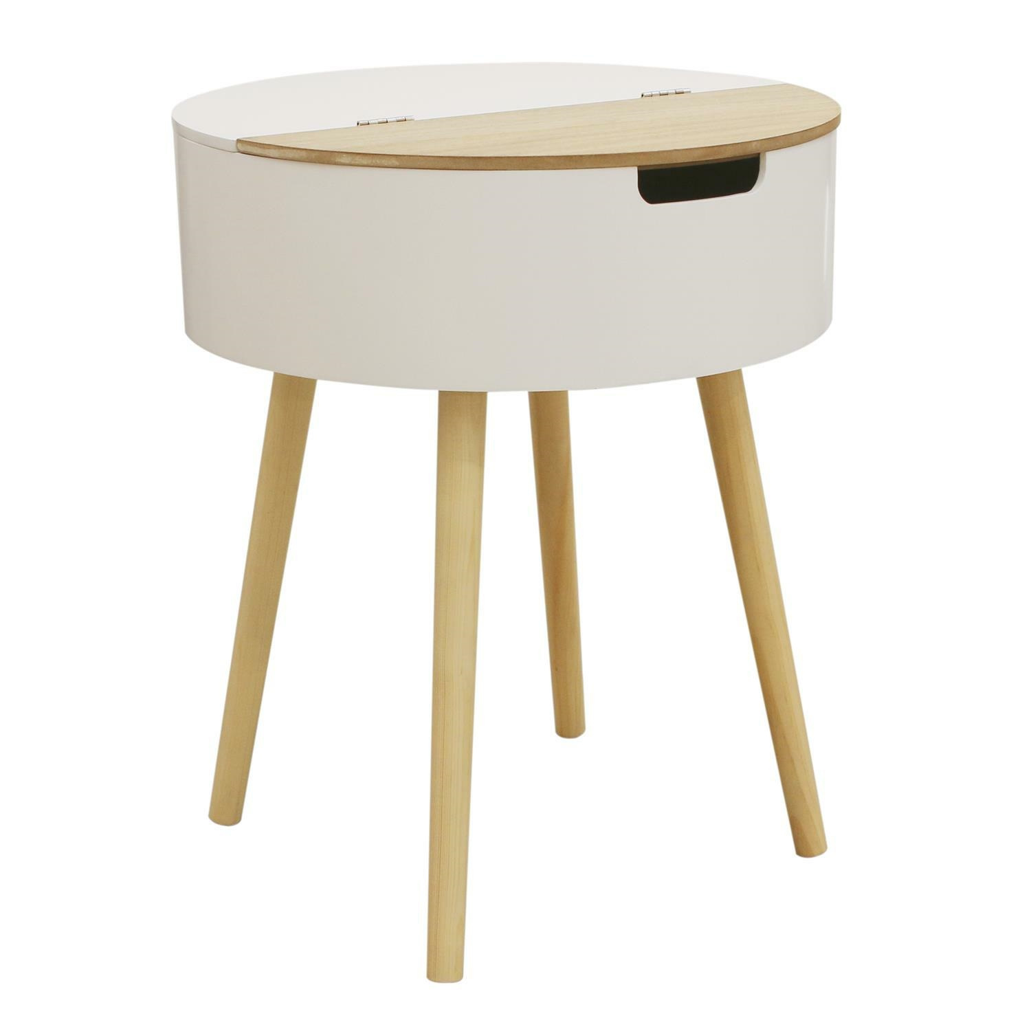 Piękny stolik będzie idealnym uzupełnieniem mebli w salonie lub sypialni. Jego dwukolorowy skandynawski design wniesie modny akcent do Twojego wnętrza, jednocześnie umożliwiając stylowe przechowywanie. Szafka posiada uchylny blat, który w połowie możemy otworzyć bez konieczności zdejmowania przedmiotó z reszty blatu. Okrągły blat wykonany z MDF umieszczony został na czterech sosnowych nogach. Materiał nogi- sosna, blat i korpus MDF Wymiary kartonu: 48x20,5x48cm Waga opakowania (kg) 4.9Cechy produktu