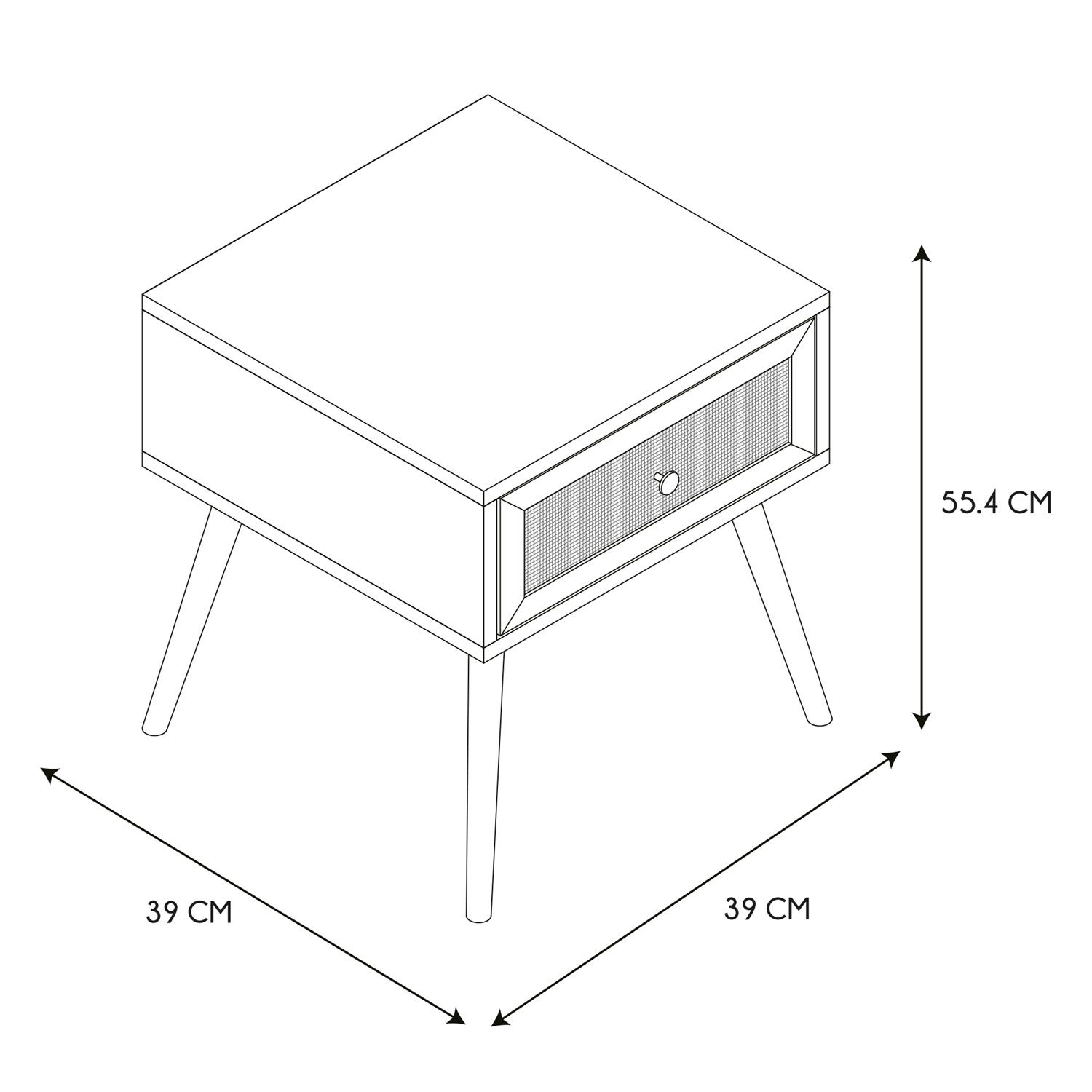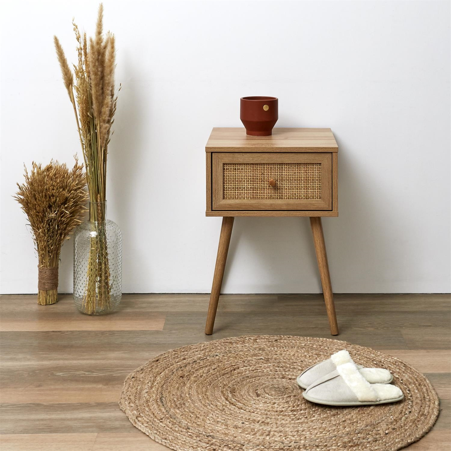 Szafka nocna Bali podkreśli styl boho w Twoim wnętrzu. Jest to wyjątkowy mebel, łączący w sobie najwyższą jakość z eleganckim designem w naturalnym stylu. Głównym materiałem wykorzystanym do jej wykonania jest płyta wiórowa udekorowana dodatkowo plecionym frontem szuflady nawiązującymi do stylistyki boho. Podstawą szafki są cztery nogi, które dzięki swojej budowie gwarantują stabilizację. Szafka wymaga samodzielnego montażu. Wysokośc nóżek 34cmCechy produktu