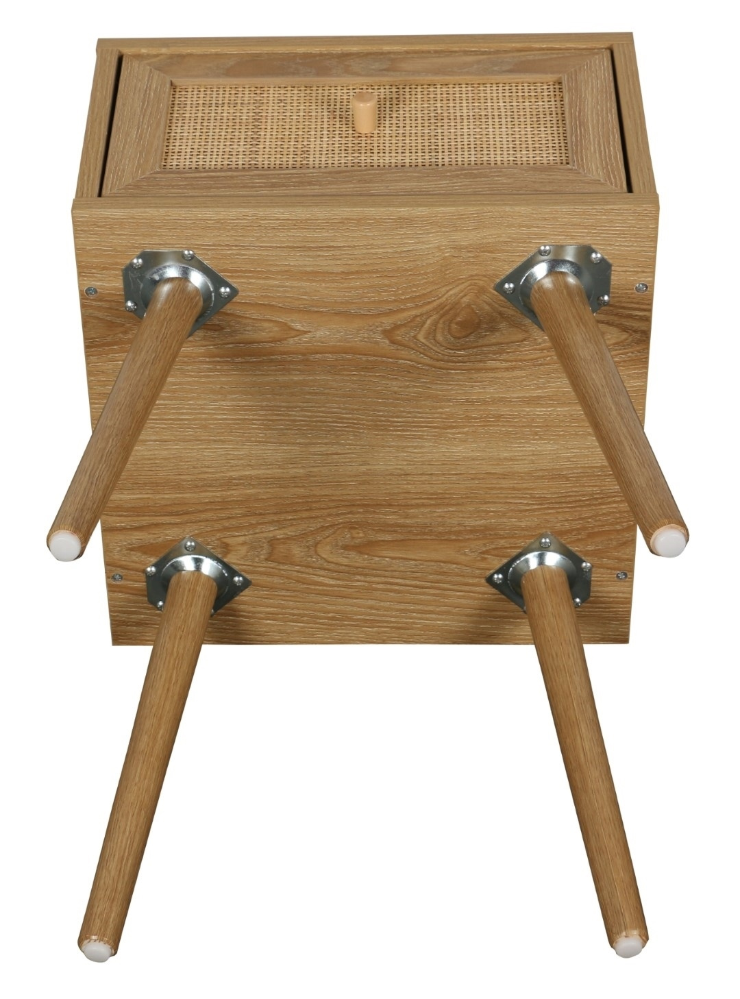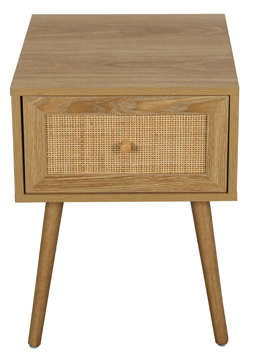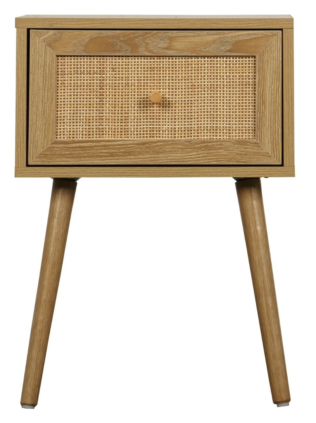 Szafka nocna z serii Ballo to nowoczesny mebel w naturalnym stylu boho. Minimalistyczna konstrukcja ozdobiona naturalnymi materiałami jak rattan czy lite drewno sprawdzi się we wnętrzu spójnym z naturalnymi kolorami. Jasna szafka o ciepłym odcieniu drewna idealnie sprawdzi się w beżowym wnętrzu. Materiał korpusu: płyta wiórowa laminowana papierowym laminatem imitującym naturalny kolor dębu. Nogi komody wykonane z litego drewna sosnowego. Rattanowa dekoracja frontów. Szuflada szafki otwiera się dzięki metalowym kulkowym prowadnicą. Wymaga montażu. Maksymalne obciążenie mebla 30 kg. Wymiary kartonu: 45x15x45cmCechy produktu