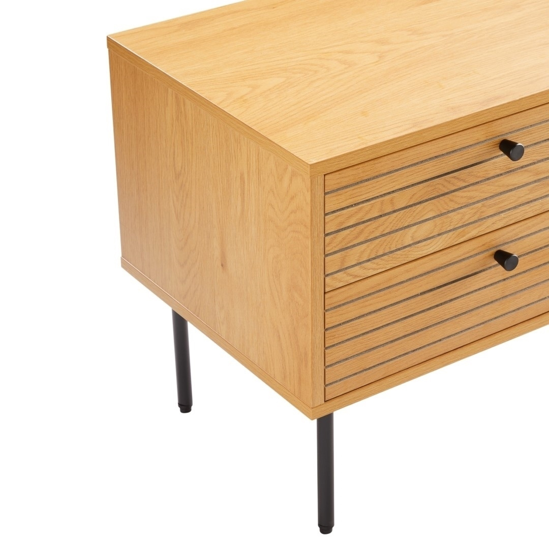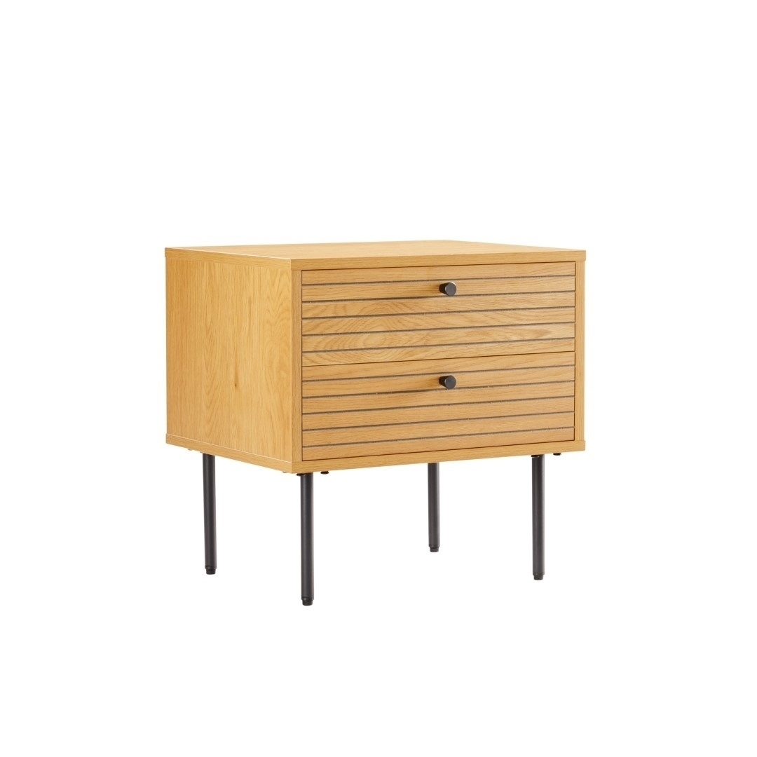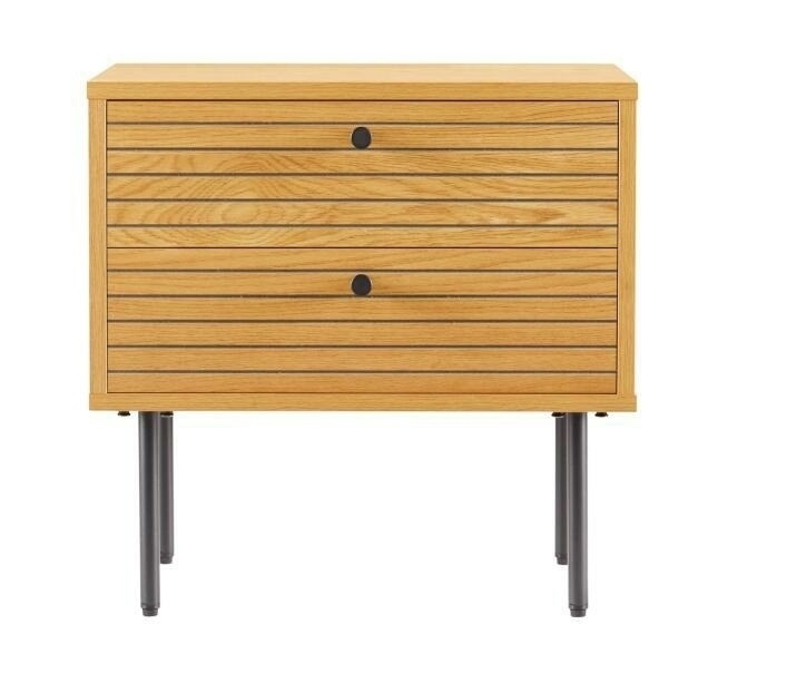 Korpus szafki jak i fornty wykonane zostały z wytrzymałej płyty MDF, która ozdobiona została okleiną imitującą fornir dębowy. Fronty szuflad o ciekawym wyflowanym poziomo wzorze wyglądają jak lamele. Każda z szuflad wyposażona została w czarny, metalowy uchwyt. Minimalistyczne uchwyty ciekawie korespondują z czarną metalową podstawą komody. Czarne nogi pomalowane zostały proszkowo dzięki czemu są odporne na uderzenia, np podczas odkurzania. Nogi komody zakończone zostały stopkami z tworzywa, aby zapobiec rysowaniu się podłogi pod meblem. Szafka wymaga montażu Wymiary kartonu: 62x48x14mCechy produktu