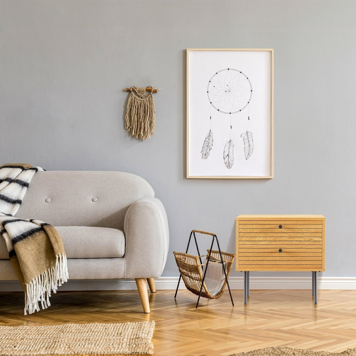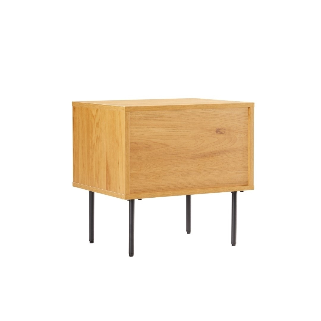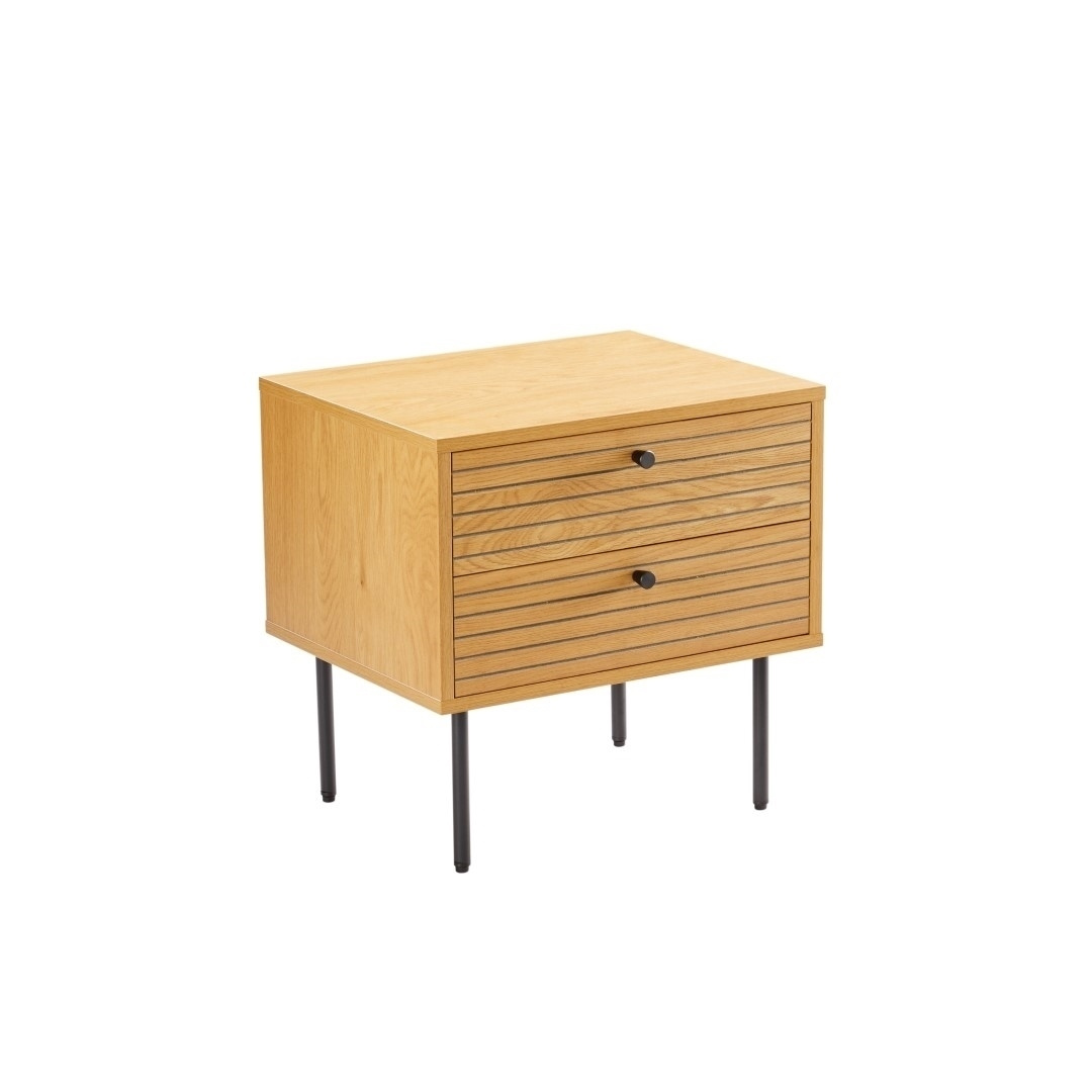 Korpus szafki jak i fornty wykonane zostały z wytrzymałej płyty MDF, która ozdobiona została okleiną imitującą fornir dębowy. Fronty szuflad o ciekawym wyflowanym poziomo wzorze wyglądają jak lamele. Każda z szuflad wyposażona została w czarny, metalowy uchwyt. Minimalistyczne uchwyty ciekawie korespondują z czarną metalową podstawą komody. Czarne nogi pomalowane zostały proszkowo dzięki czemu są odporne na uderzenia, np podczas odkurzania. Nogi komody zakończone zostały stopkami z tworzywa, aby zapobiec rysowaniu się podłogi pod meblem. Szafka wymaga montażu Wymiary kartonu: 62x48x14mCechy produktu