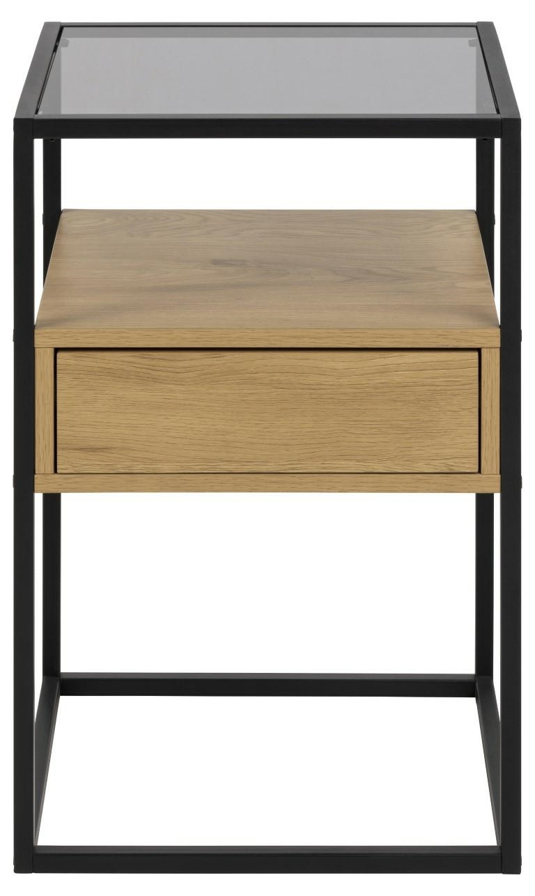 - Szafka nocna Randolf to stylowe połączenie elementów szklanych, metalowych i drewnianych. Jej szkielet wykonany jest z malowanego proszkowo metalu w kolorze czarnym. Kwadratowy blat to dymione szkło hartowane, zaś znajdująca się pod nim szuflada to w cało