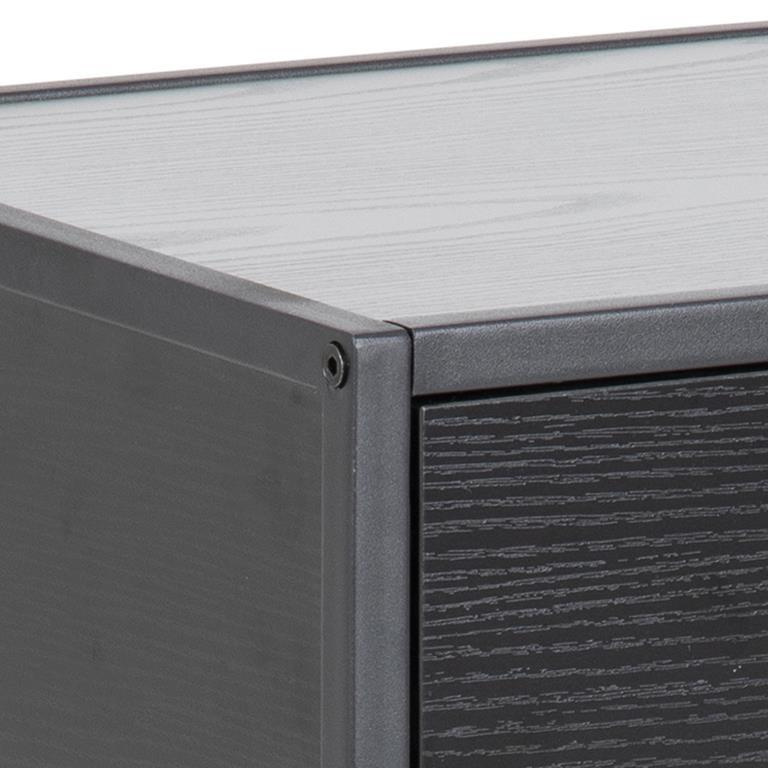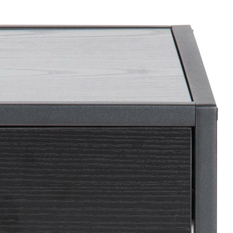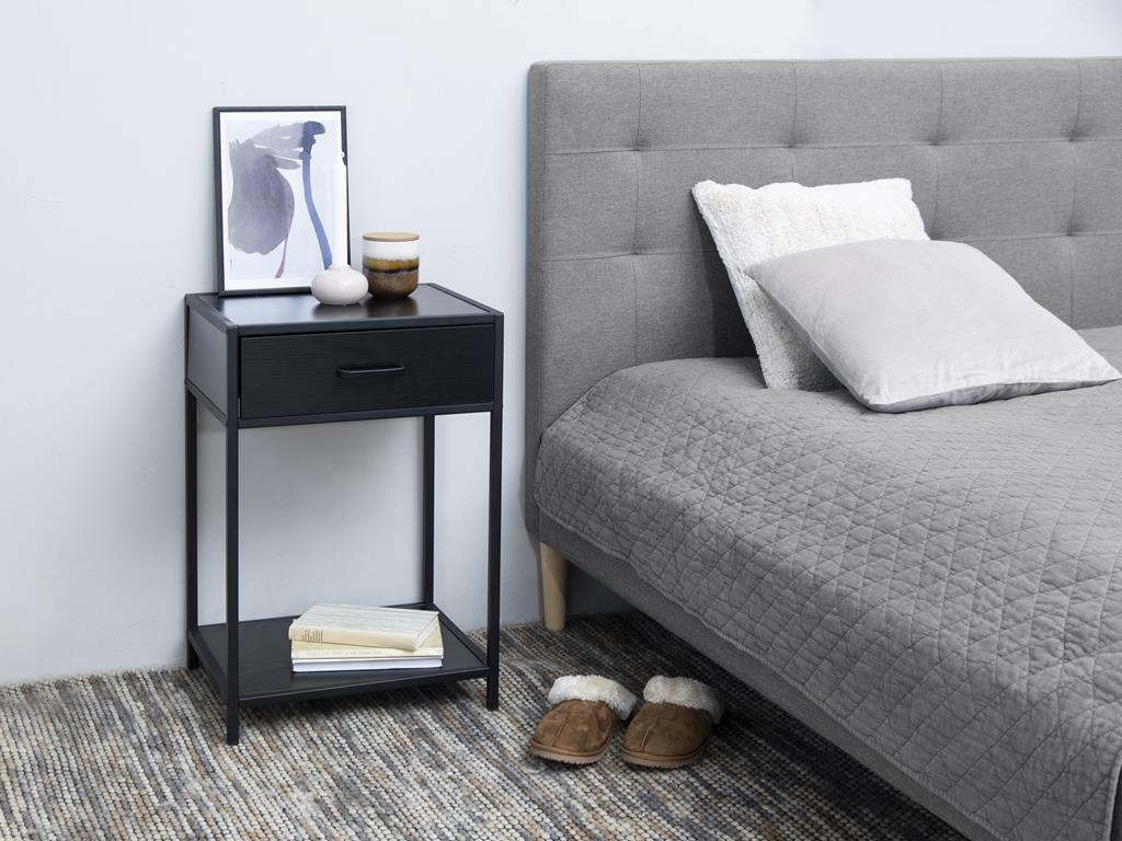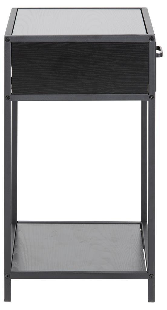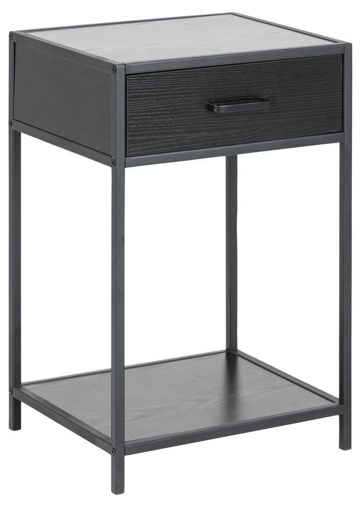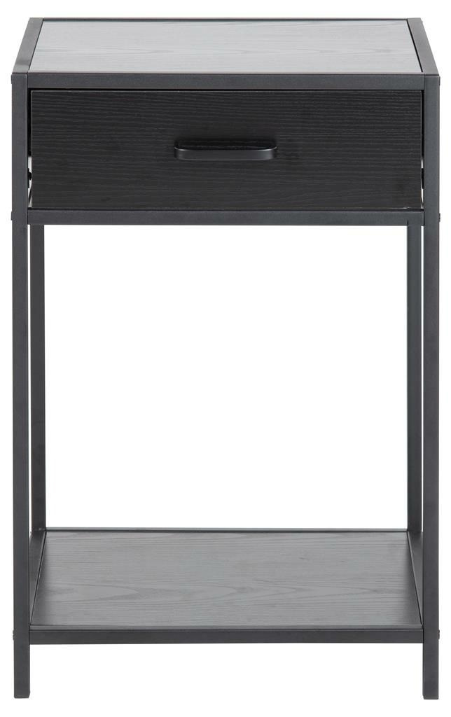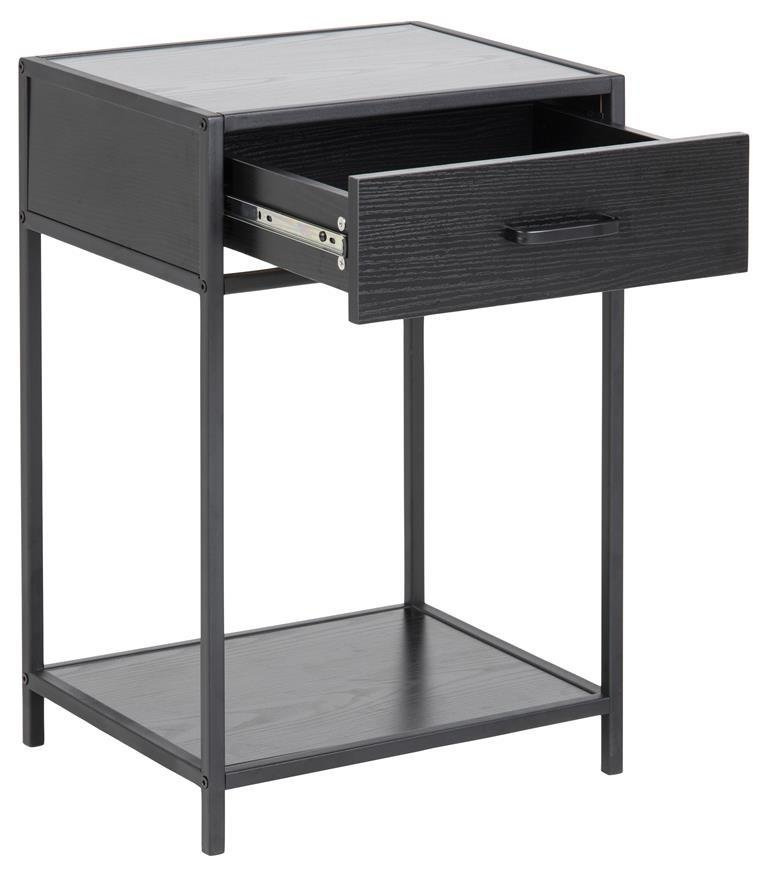 - Szafka nocna Seaford to industrialny mebel wykonany z metalu oraz płyty MDF wykończonej laminatem w kolorze czarnym. Podstawa jak i baza posiadają matowe wykończenie. Całość mebla utrzymana jest w ciemnej kolorystyce. Maksymalne obciążenie szafki wynosi 3