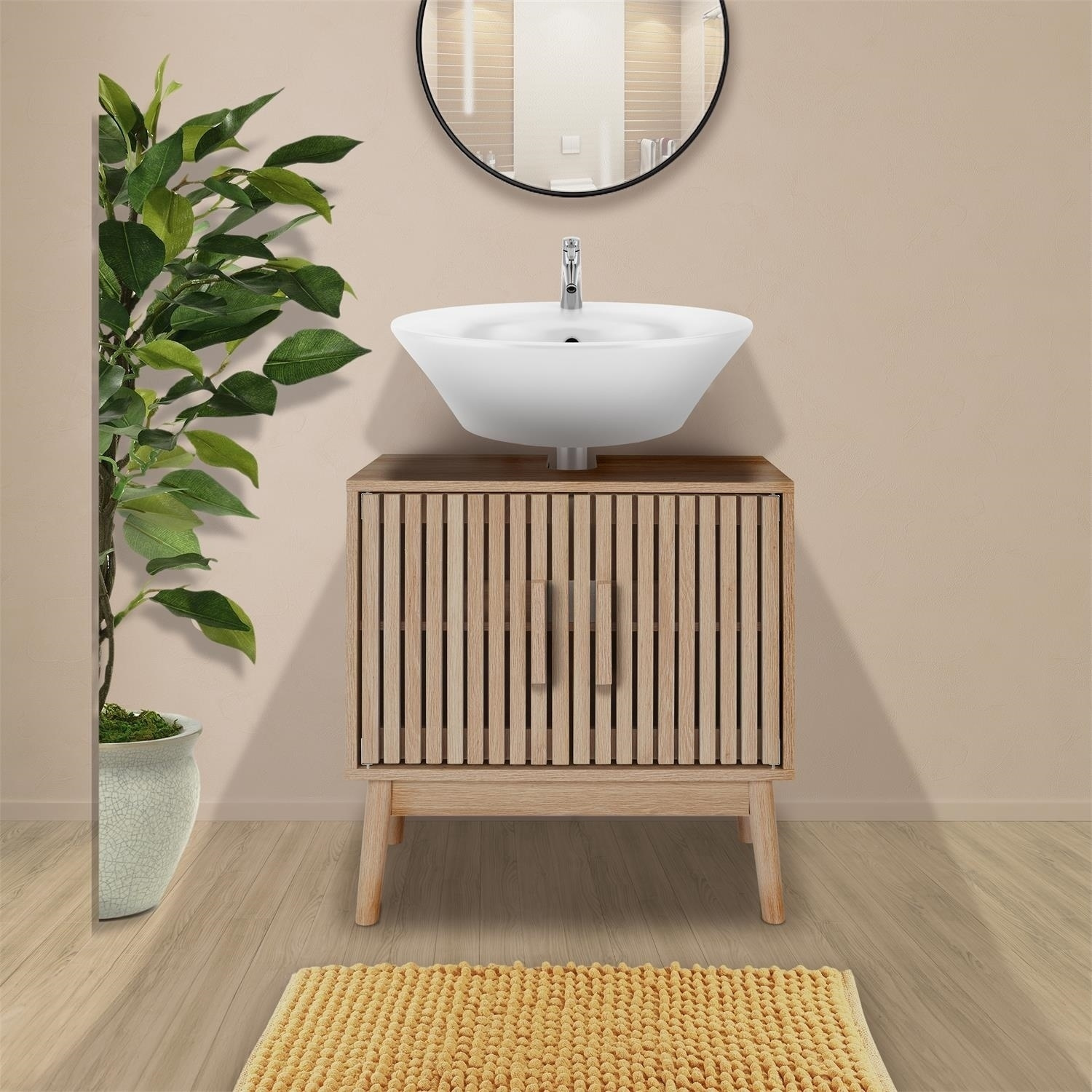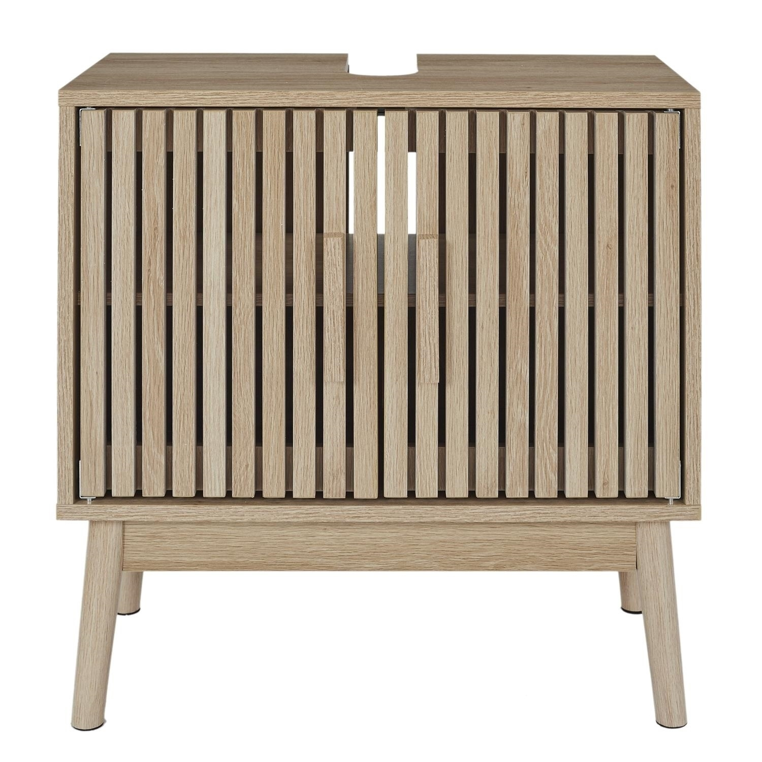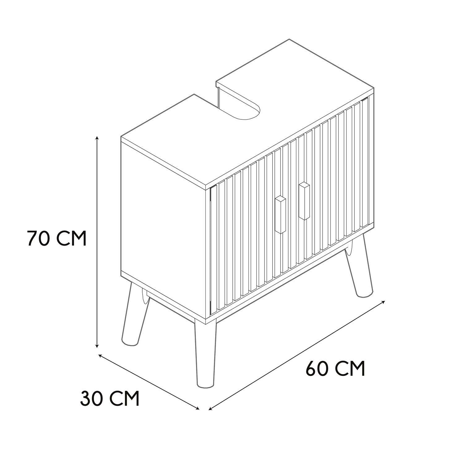 Szafka pod umywalkę Klaus to nowoczesny mebel łazienkowy o eleganckim i minimalistycznym designie. Fronty szafki są zdobione pionowymi, wąskimi listwami, które tworzą ciekawy efekt wizualny i dodają tekstury. Uchwyty są zintegrowane z frontami, co podkreśla nowoczesny charakter mebla. Szafka stoi na czterech krótkich nogach, które są lekko rozstawione na zewnątrz, co zapewnia jej stabilność. Długość produktu (CM): 60 Wysokość produktu (CM): 70 Głębokość produktu (CM): 30 Waga produktu (GR): 13300 Materiał: drewno sosna, MDF, papierCechy produktu