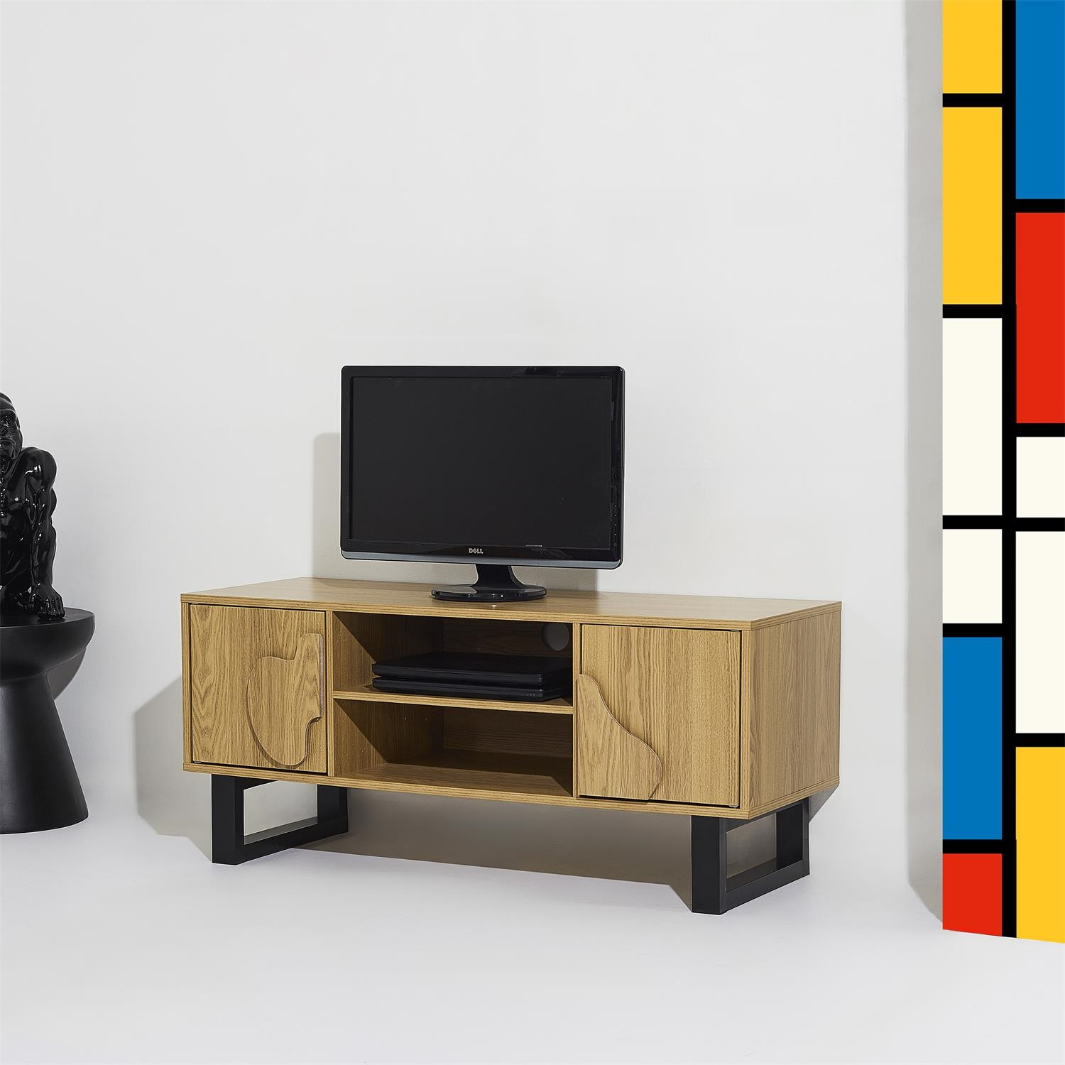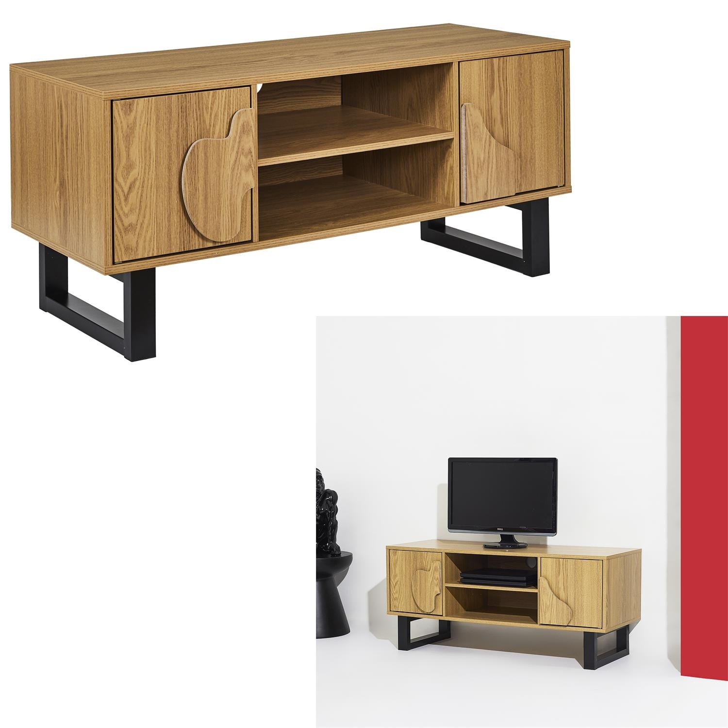 Szafka RTV Calypso sprawdzi się w salonie lub sypialni jako szafka na multimedia. Szafka wyposazona w 2 fronty ukryje przedmioty, które niekoniecznie chcemy mieć na wierzchu jak np. kable do ładowarek, natomias środkowe półki beda idealne na dekoder lub router. Szafka wyposażona jest w otwór na przewody co pozwoli na swobodne ustawienie sprzętów elektronicznych. Szafka Calypso wykonana została z wytrzymałej płyty MDF w okleinie imitującej drewno, a jej podstawa to metalowe nogi w kształcie płozy. Szafka wymaga montażu. Max. obciązenie 40 kg.Cechy produktu