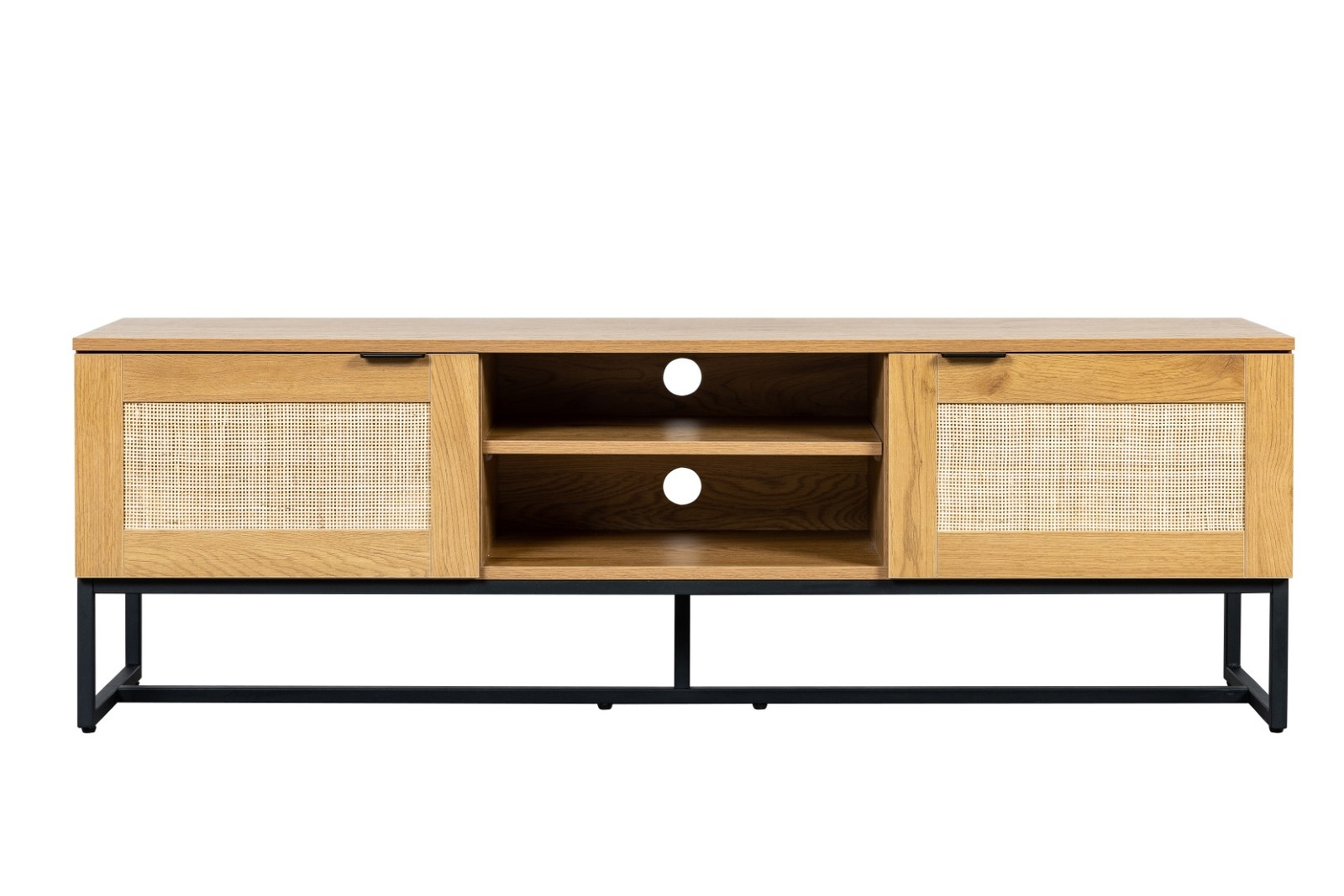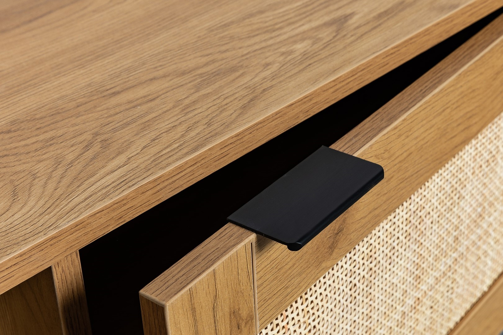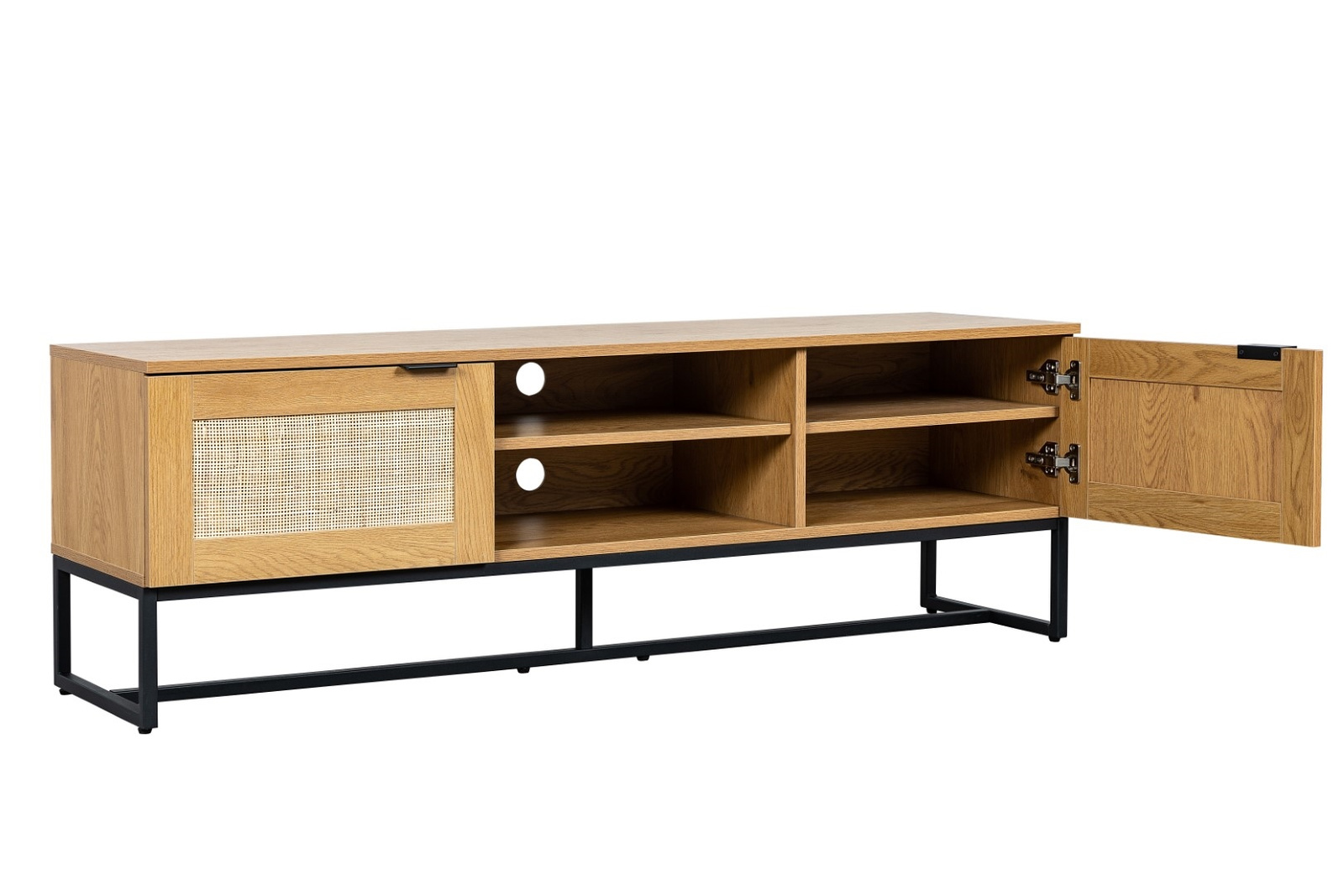 Szafka RTV w stylu boho z rattanowymi frontami to idealny mebel do sypialni lub salonu w naturalnych, jasnych kolorach. Szafka RTV Capri z dwoma frontami skrywa w sobie półki, na których możemy przechowywać płyty z filmami lub nawet schować dekoder telewizyjny lub router internetwy. Szafka RTV stoi stabilnie dzięki metalowej podstawie. Nogi komody zostały polakierowane proszkowo na czarno. Dębowa okleina, którą została wykończona szafka, niezwykle dokładnie imituje naturalny kolor oraz teksturę drewna. Swoją wytrzymałość komoda zawdzięcza trwałym materiałom jak płyta MDF, z której wykonany został korpus oraz metal użyty na podstawie. Fronty szafki w środku wykonane zostały z naturalnego rattanu. Naturalny rattan to nie tylko niewiarygodnie dobrze wyglądający materiał. Rattan przede wszystkim gwarantuje cyrkulację powietrza w komodzie. Wymiary kartonu: 161.5x48x14cmCechy produktu