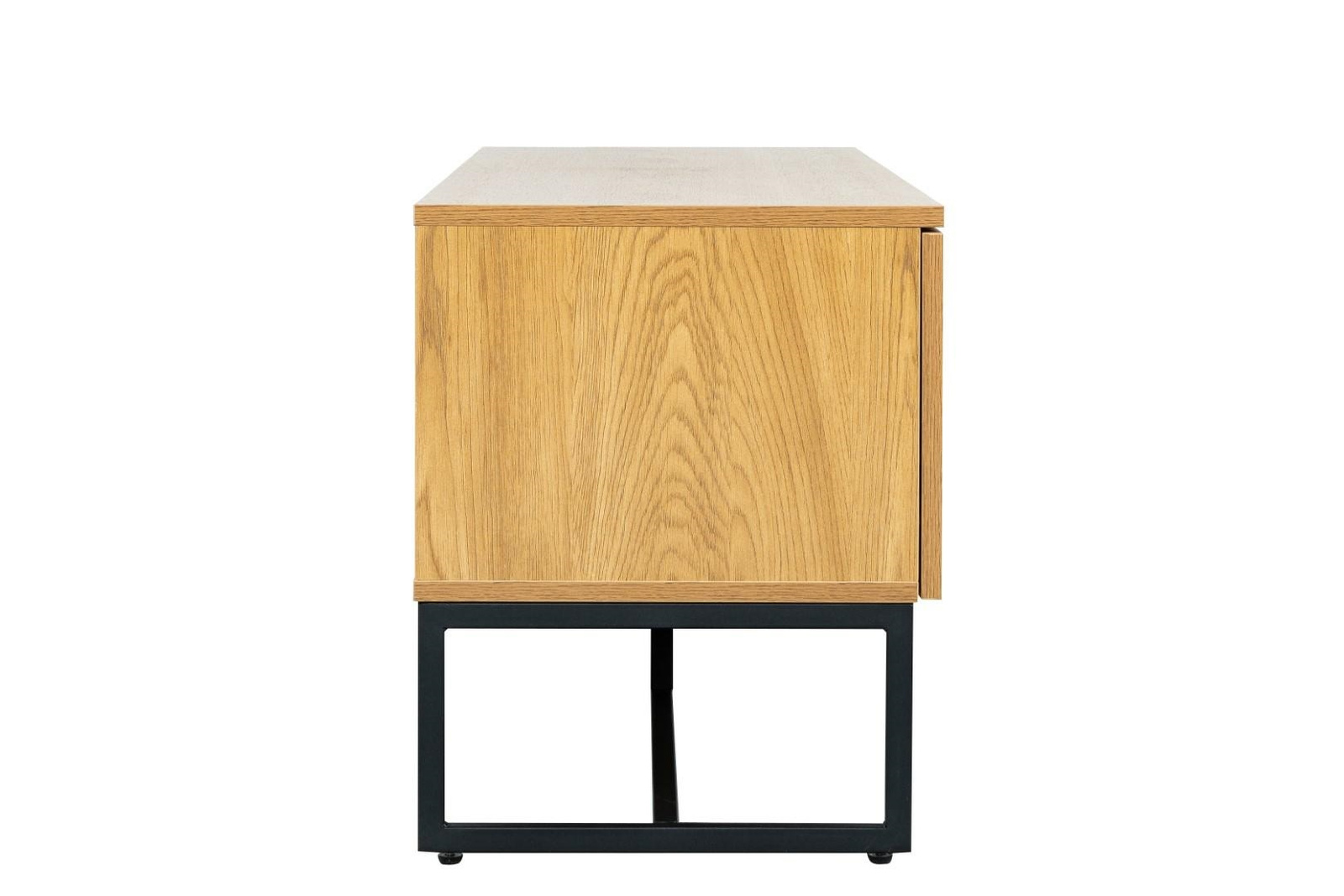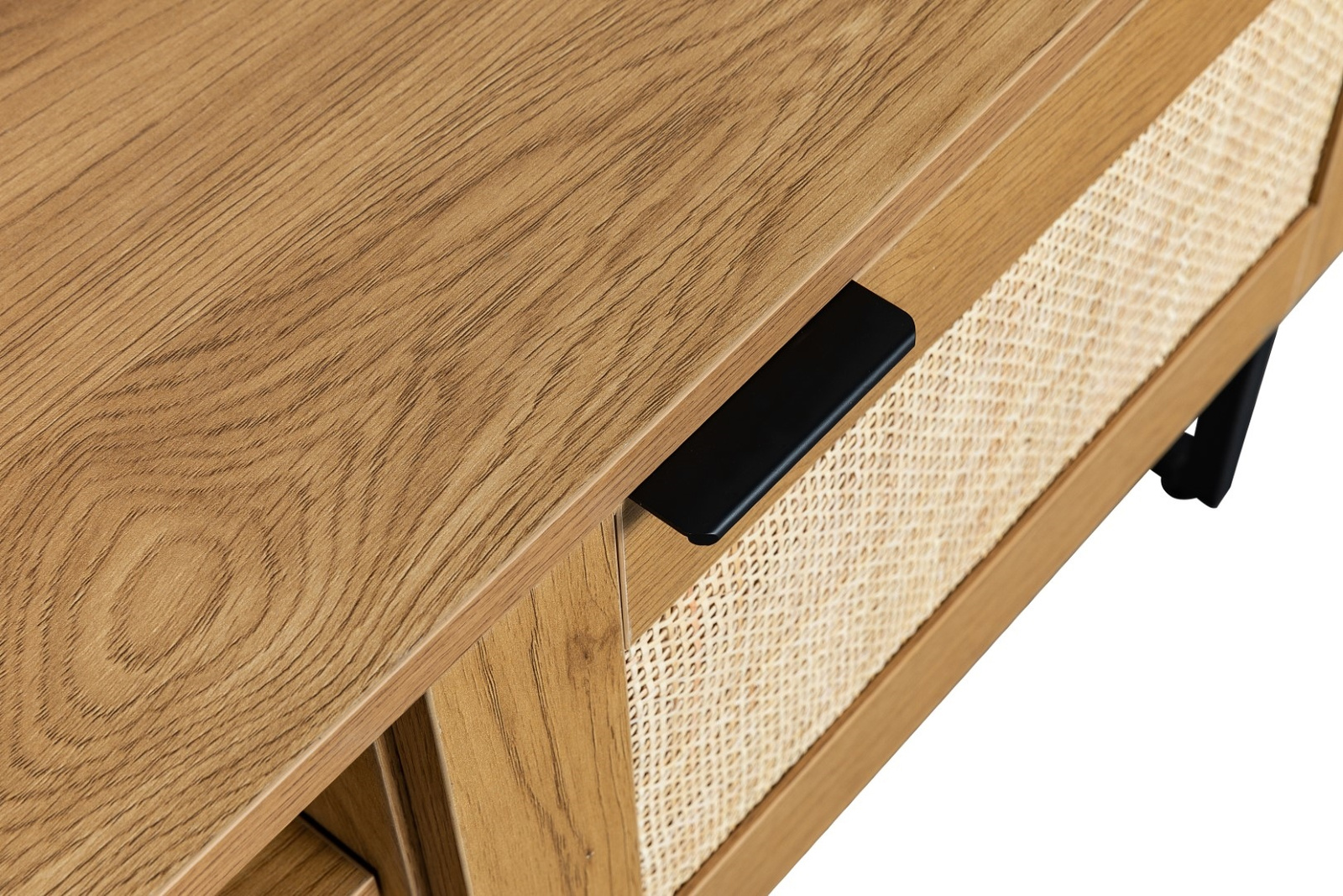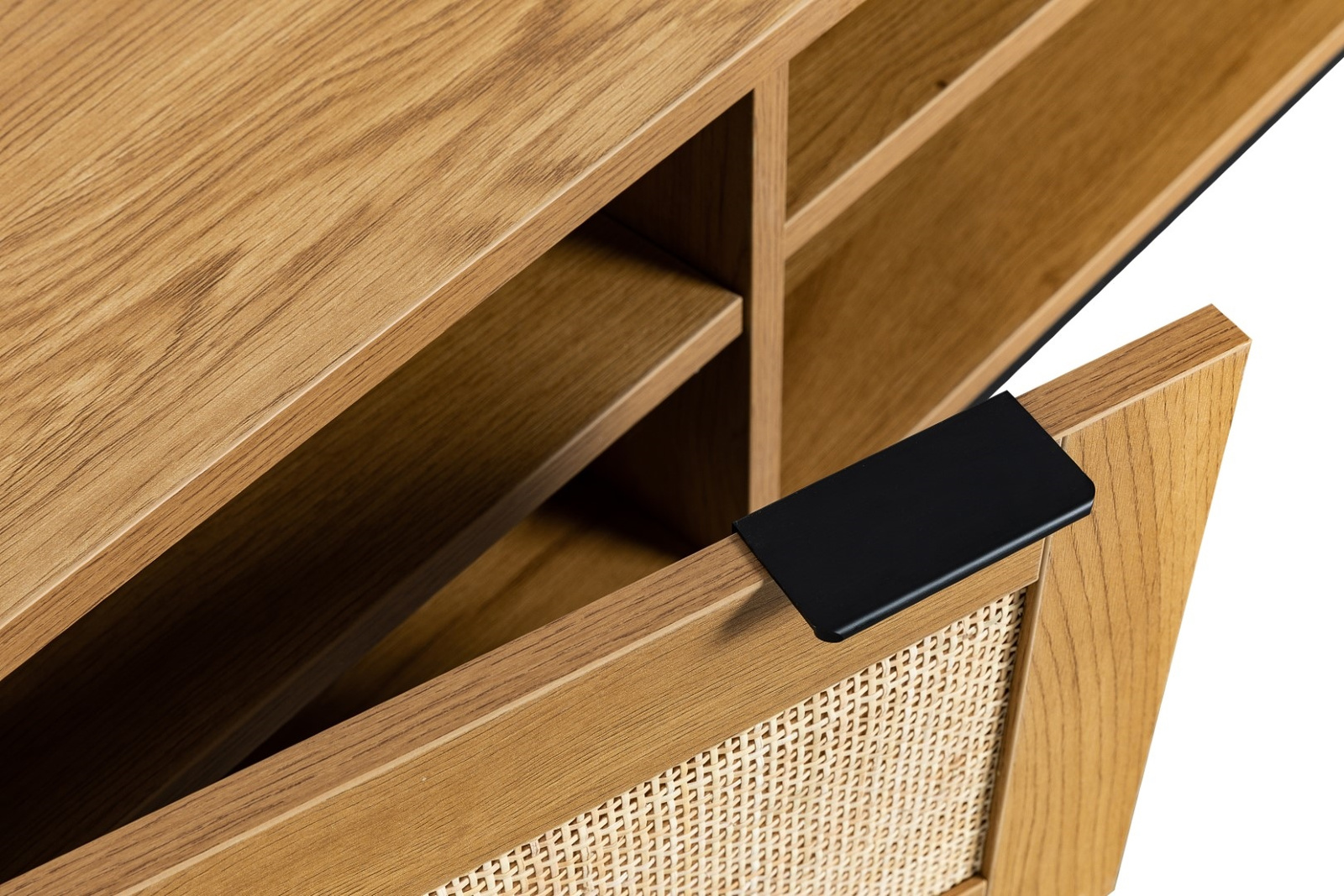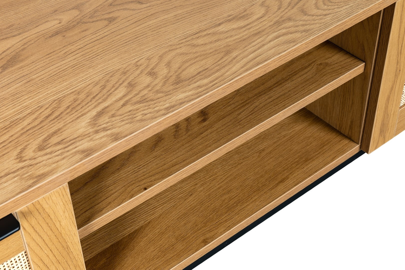 Szafka RTV w stylu boho z rattanowymi frontami to idealny mebel do sypialni lub salonu w naturalnych, jasnych kolorach. Szafka RTV Capri z dwoma frontami skrywa w sobie półki, na których możemy przechowywać płyty z filmami lub nawet schować dekoder telewizyjny lub router internetwy. Szafka RTV stoi stabilnie dzięki metalowej podstawie. Nogi komody zostały polakierowane proszkowo na czarno. Dębowa okleina, którą została wykończona szafka, niezwykle dokładnie imituje naturalny kolor oraz teksturę drewna. Swoją wytrzymałość komoda zawdzięcza trwałym materiałom jak płyta MDF, z której wykonany został korpus oraz metal użyty na podstawie. Fronty szafki w środku wykonane zostały z naturalnego rattanu. Naturalny rattan to nie tylko niewiarygodnie dobrze wyglądający materiał. Rattan przede wszystkim gwarantuje cyrkulację powietrza w komodzie. Wymiary kartonu: 161.5x48x14cmCechy produktu