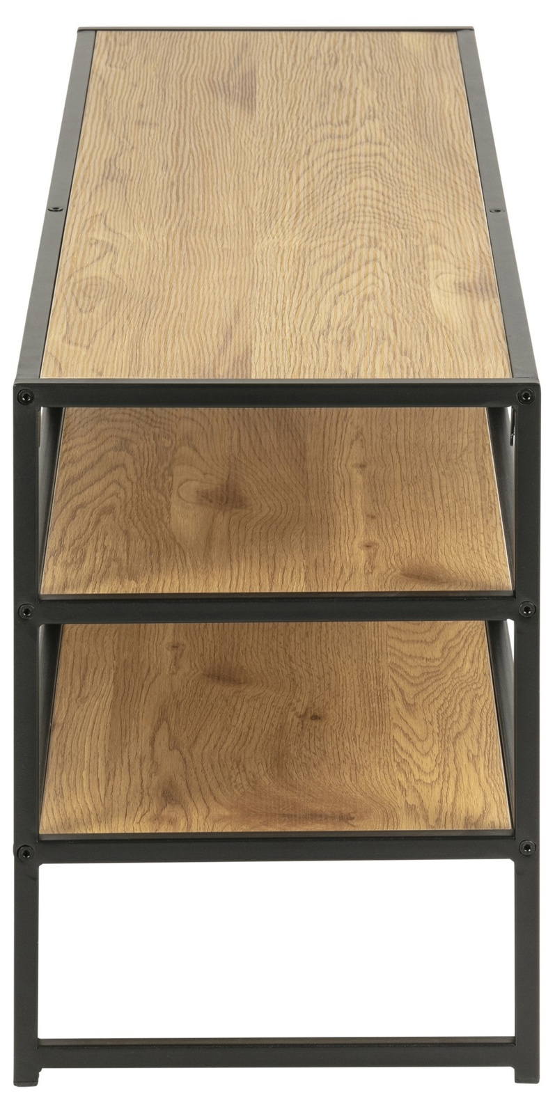 Seaford szafka RTV jest kolejnym elementem rozchwytywanej serii Seaford. Seria mebli Seaford charakteryzuje się pięknymi teksturami zamkniętymi w prostej formie. Szafka RTV została zrobiona z metalu pomalowanego proszkowo na czarno. Cztery półki szafki zostały zrobione z płyty MDF pokrytej okleiną imitującą naturalne drewno dębu. Matowe wykończenie szafki jest idealne do wnętrz w stylu industrialnym. Waga: 11,9 kg. Wymiary kartonu: 13,5cm x 124cm x 34cmCechy produktu
