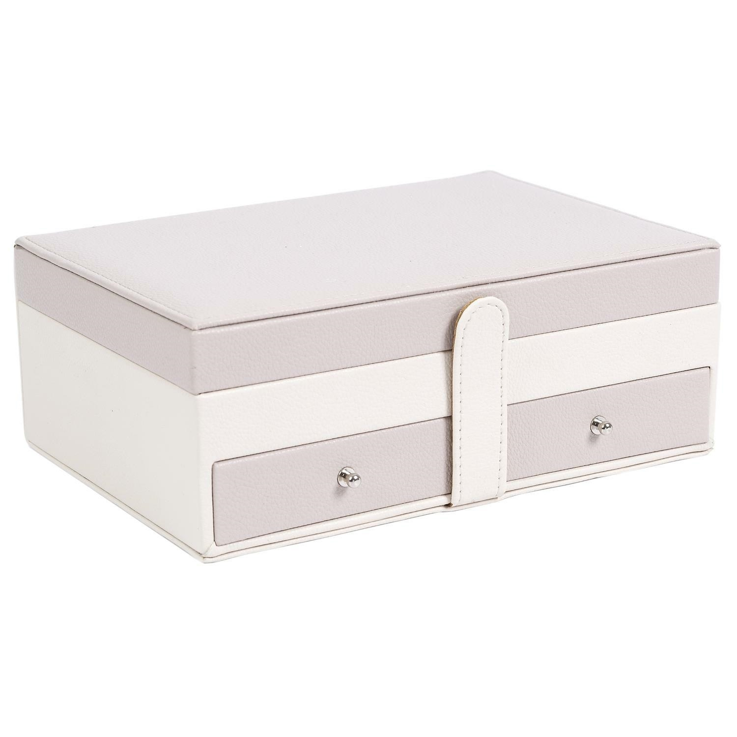 Szkatułka Lady to wszystko czego potrzebujesz, aby utrzymać ład i porządek wśród swojej biżuterii. Posiada ona wiele przegródek na pierścionki, kolczyki czy bransoletki. W środku wyściełana jest przyjemną w dotyku tkaniną. Jej atuty to także dwie pojemne szufladki, wewnętzne lusterko, a także dodatkowa kieszonka na wieczku. Szkatułka pokryta skórą ekologiczną zamykana jest na wygodny zatrzask. Ilość kartonów: 1 Wymiary kartonów: 25x9,5x17cmCechy produktu