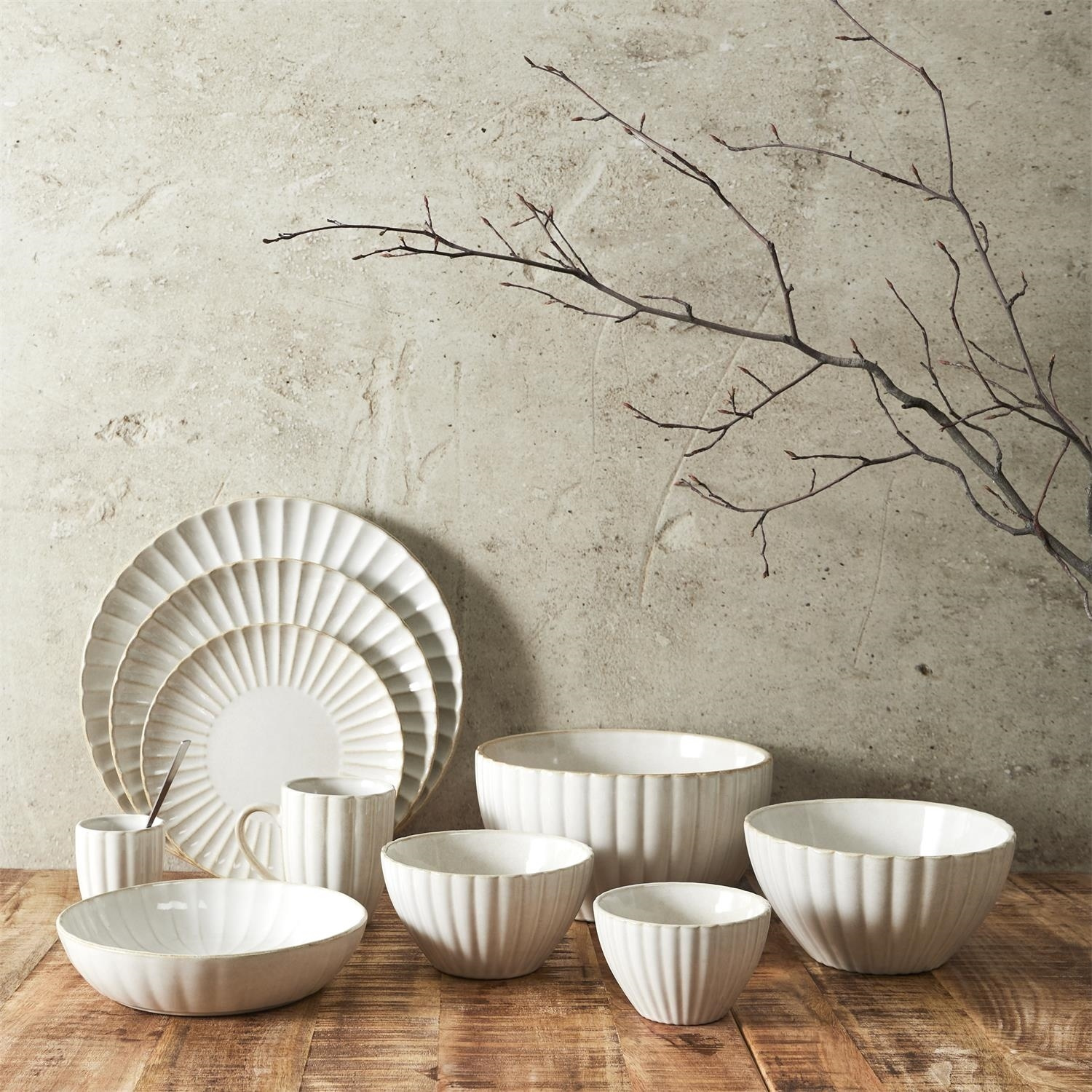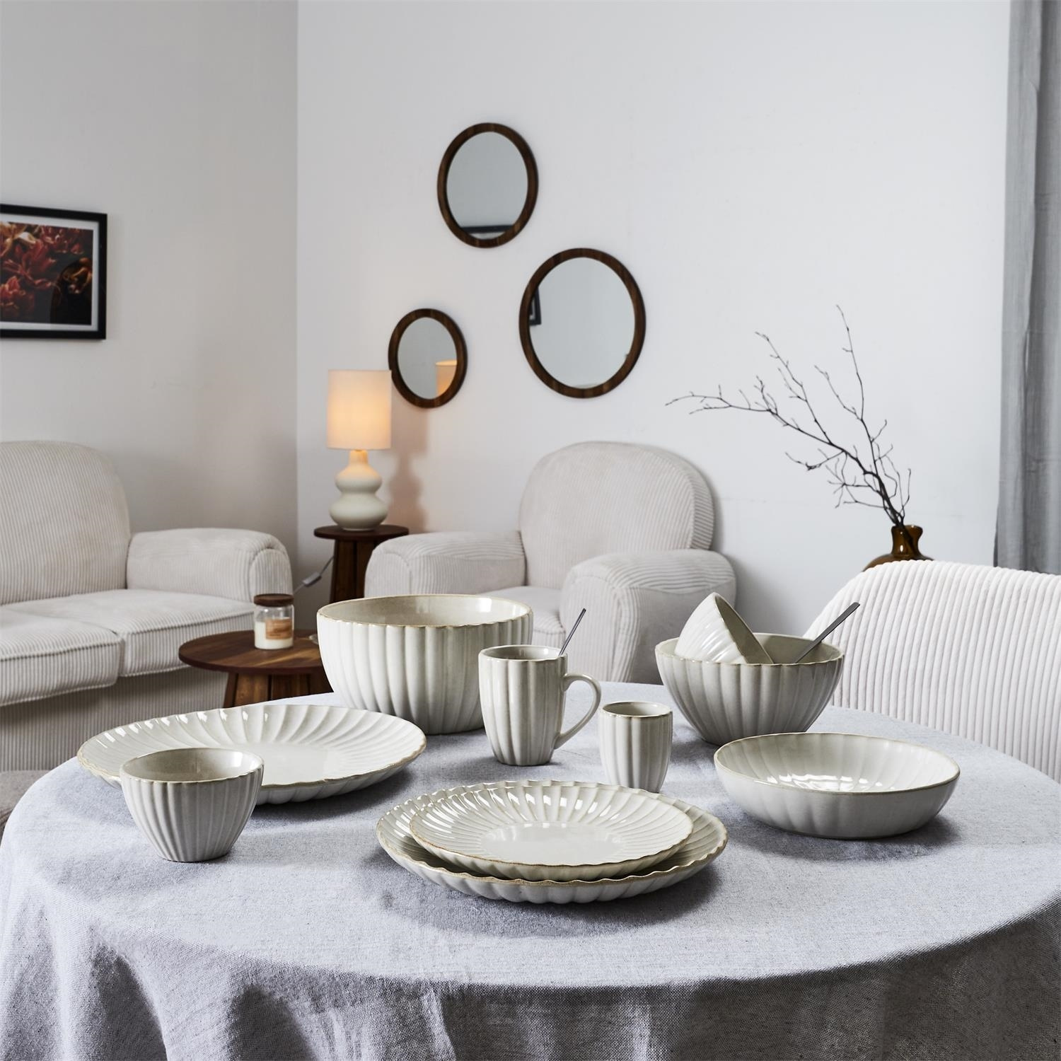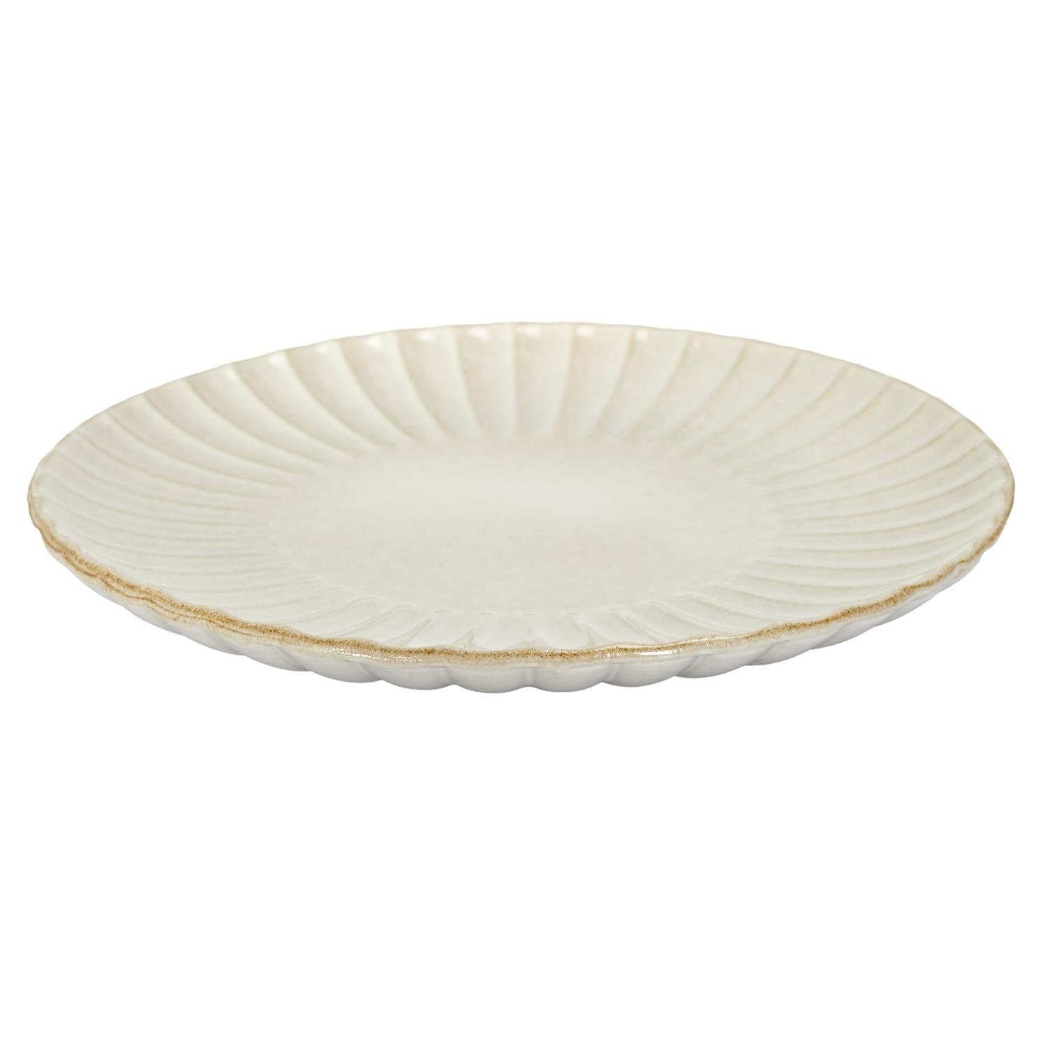 Talerz o średnicy 32cm Vlora to sztuka sama w sobie. Ciekawy kształt, delikatny, beżowy kolor sprawiają, że zastawa stołowa Vloga jest subtelna a zarazem ponadczasowa. Ryflowane brzegi talerza przypominają trochę kształt morskiej muszelki. Takerz można myć w zmywarce, można używać w mikrofalówce. Nie można talerza używać w piekarniku i w zamrażarce. Materiał: ceramika