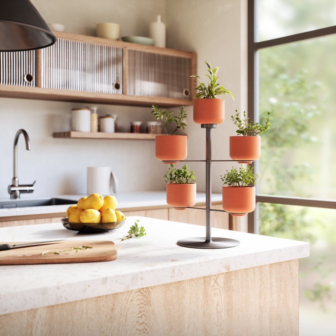 - UMBRA doniczka stołowa TERRAPOTTA tytanowa. Doniczka stołowa, z uchwytem na 5 doniczek wykonanych z terakoty. Ten stojak doda świeżości oraz innowacji twojemu mieszkaniu. Składa się ona z dwóch metalowych prętów, które obracają się o 360 stopni. Można w n