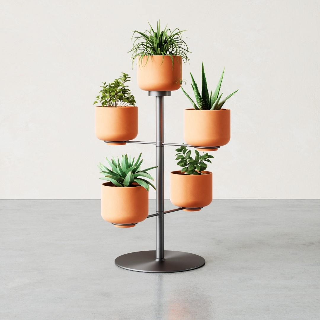 UMBRA doniczka stołowa TERRAPOTTA tytanowa. Doniczka stołowa, z uchwytem na 5 doniczek wykonanych z terakoty. Ten stojak doda świeżości oraz innowacji twojemu mieszkaniu. Składa się ona z dwóch metalowych prętów, które obracają się o 360 stopni. Można w nich posadzić sukulenty, winoroślą czy inne małe rośliny. Jest oparta na solidnej metalowej podstawie, dzięki czemu jest trwała i odporna na rdzę.Cechy produktu