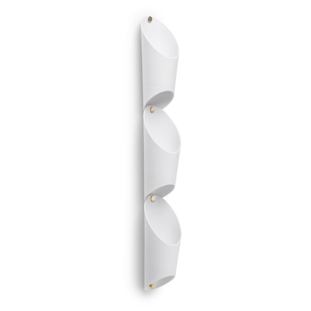 UMBRA kwietnik FLORALNIK Składa się z trzech doniczek ściennych, połączonych ze sobą kaskadowo. Kwietnik swym wyglądem przypomina piszczałki organowe. Całość może posłużyć nam także jako organizer, w którym możemy przechowywać np. kosmetyki. Ta dekoracja ścienna idealnie wkomponuje się w mniejsze pomieszczenia i optycznie zwiększy przestrzeń. Floralnik jest łatwy i bezproblemowy w montażu — zestaw wymaga tylko jednego otworu w ścianie do zawieszenia. Waga: 0,58 kg.Cechy produktu