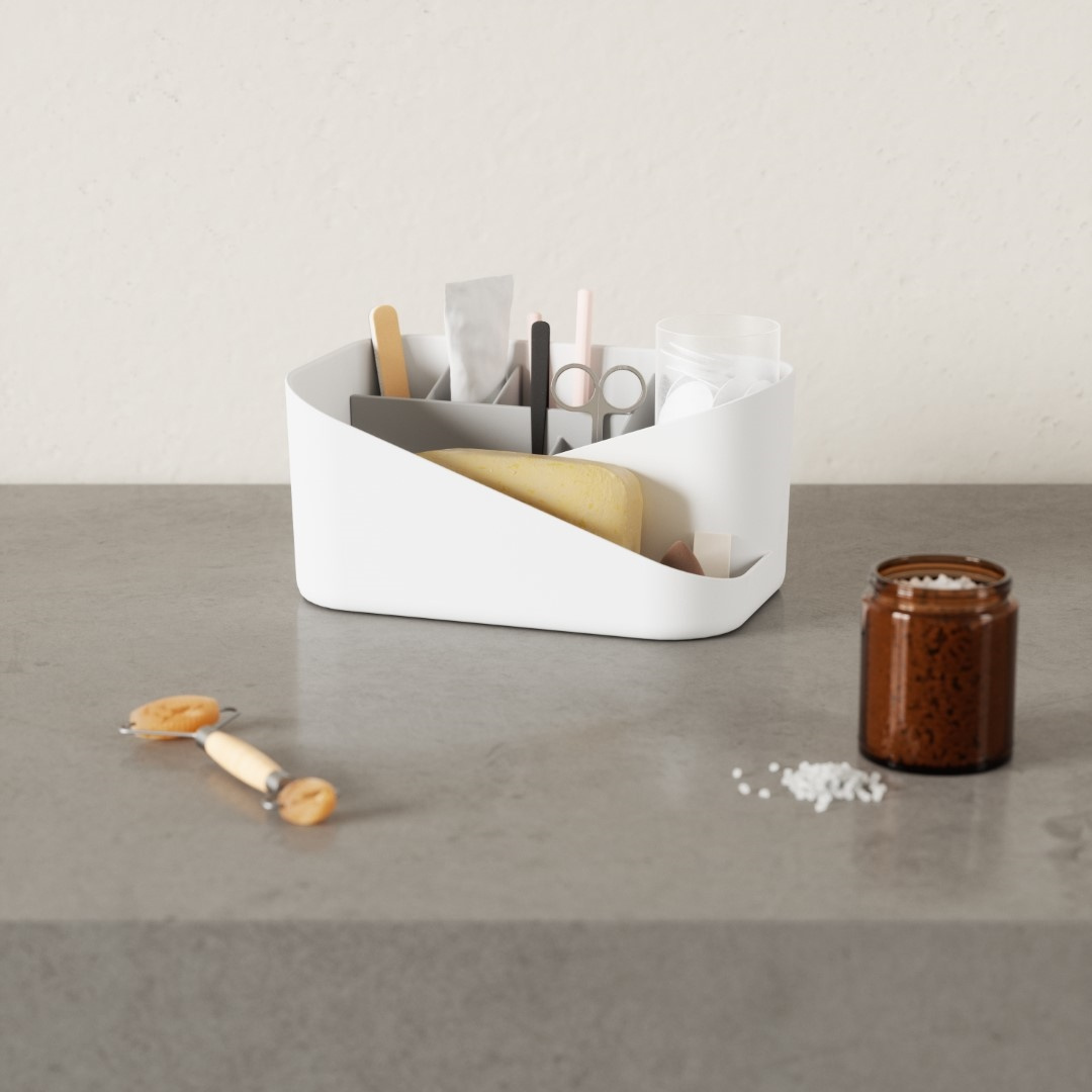 - UMBRA organizer kosmetyków GLAM biało-szary. Ten świetny organizer na przybory do makijażu, zapewnia przechowywanie niezbędnych akcesoriów do codziennej pielęgnacji. Dzięki przegródkom, o różnych rozmiarach i wyjmowanej wkładce, można go umieścić pod zlew