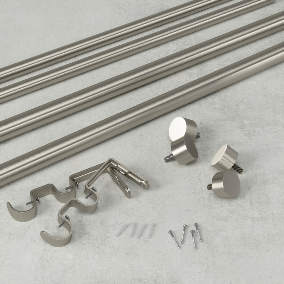 UMBRA podwójny karnisz CAPPA 305 - 457 cm srebrny Karnisz został wykonany z wysokiej jakości metalu. Posiada on opcję regulacji i zapewnia nam elastyczność w zakresie konfiguracji jednej lub dwóch zasłoń w zależności od potrzeb. Karnisz obsługuje różne fasony z maksymalną wagą do 10 kg. W zestawie znajdziesz wszystko, co potrzebne, metalowe wsporniki, karnisz, śruby, kotwy do płyt kartowono-gipsowych oraz instrukcję. Średnica pręta: 2,5 cm Zawiera pręt o średnicy: 3/4 Średnica tylnego pręta: 2,5 cm Przy karniszu: 36 - 66 cm obejmują tylko, dwa wsporniki-wszystkie pozostałe zawierają 3 wsporniki Waga: 3 kg.