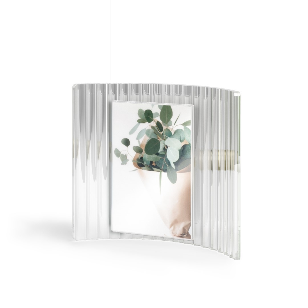 UMBRA ramka na zdjęcia RIPLEY o wymiarach 4 cm x 6 cm. Zaprezentuj swoje ulubione zdjęcia w wyjątkowy i elegancki sposób dzięki ramce do zdjęć Ripley. Ramka ma prążkowany podkład ze szkła, a jego zakrzywiony łuk dodaje miękkości i nowoczesności. Oglądaj zdjęcia w orientacji poziomej lub pionowej, po prostu odkręcając pokrętło i zmieniając orientację ramki.Cechy produktu