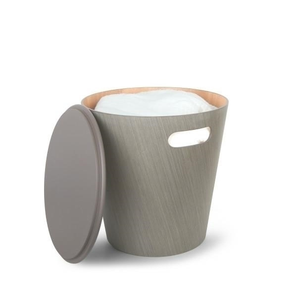 - UMBRA stolik WOODROW w kolorze szarym. Woodrow to nowoczesne i eleganckie podejście do typowej osmańki o pięknym, naturalnym wykończeniu z drewna i kształcie geometrycznym, wykonane z drewna poddanego obróbce, wygięte w zwężający się cylindryczny kształt.
