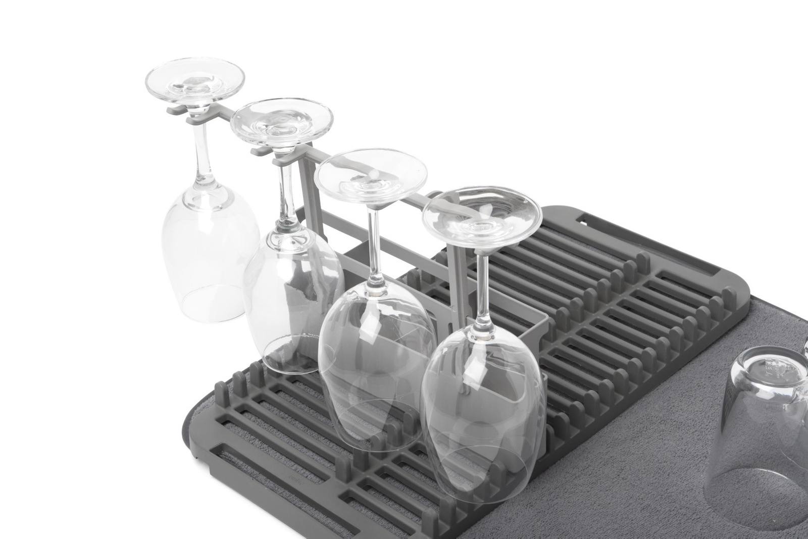 Innowacyjne rozwiązanie do małych kuchni. Lekka i niezwykle chłonna suszarka do naczyń Udry marki Umbra to kompaktowy sposób na organizację naczyń i sztućców. Udry składa się z maty absorbującej wilgoć oraz stojaka na naczynia, sztućce i kuchenne akcesoria. Mata nie tylko wchłania wodę, ale i zabezpiecza powierzchnię wokół zlewu przed porysowaniem przez naczynia. Stojak można użyć również osobno, a całość zdemontować i bardzo łatwo wyczyścić. Suszarkę można złożyć i umieścić w szafce lub szufladzie, dzięki czemu zajmuje bardzo niewiele przestrzeni. Jest przeznaczona przede wszystkim do niewielkich kuchni. Sprawdza się w mieszkaniach i biurach.Cechy produktu