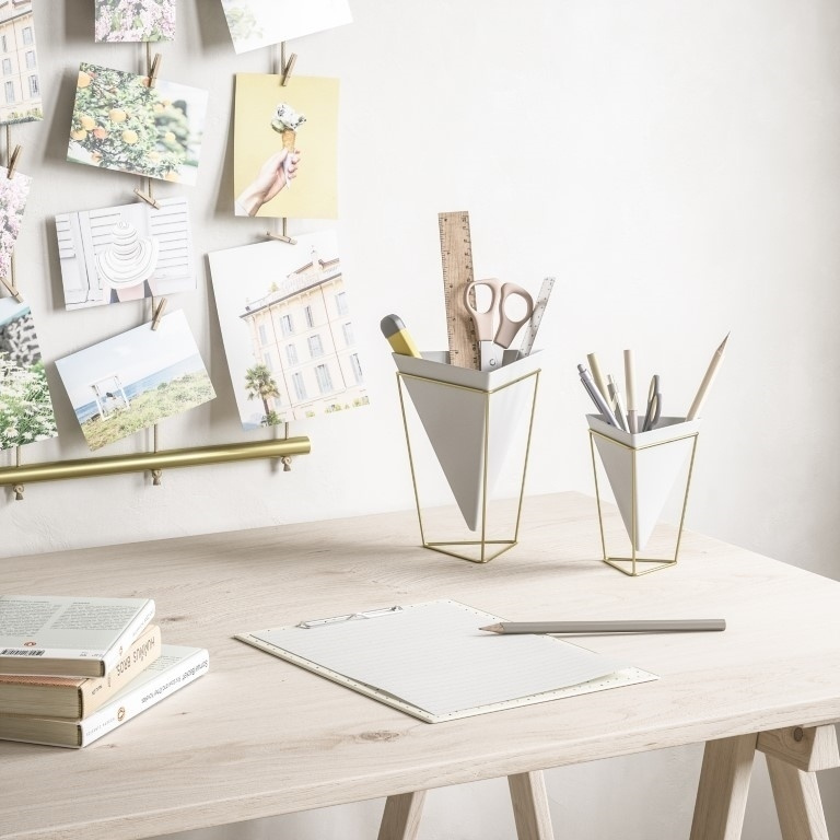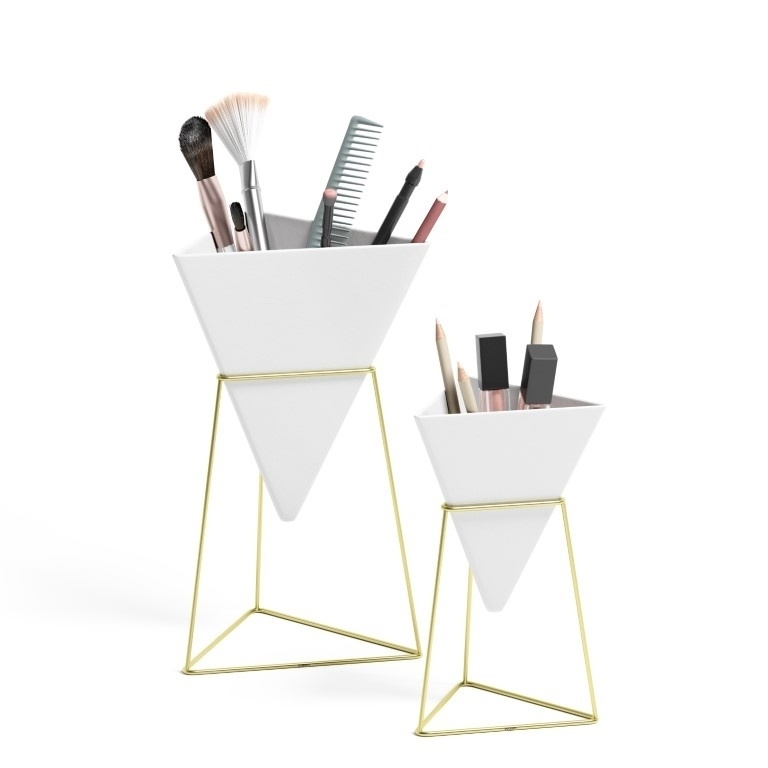 - UMBRA zestaw doniczek TRIGG. Trigg Tabletop Vessels to ekscytujący sposób na przechowywanie małych roślin, długopisy, ołówków a nawet akcesoria do makijażu, na widoku i pod ręką. Ten dekoracyjny zestaw doniczek wyposażony w ceramiczne naczynie i stojak z