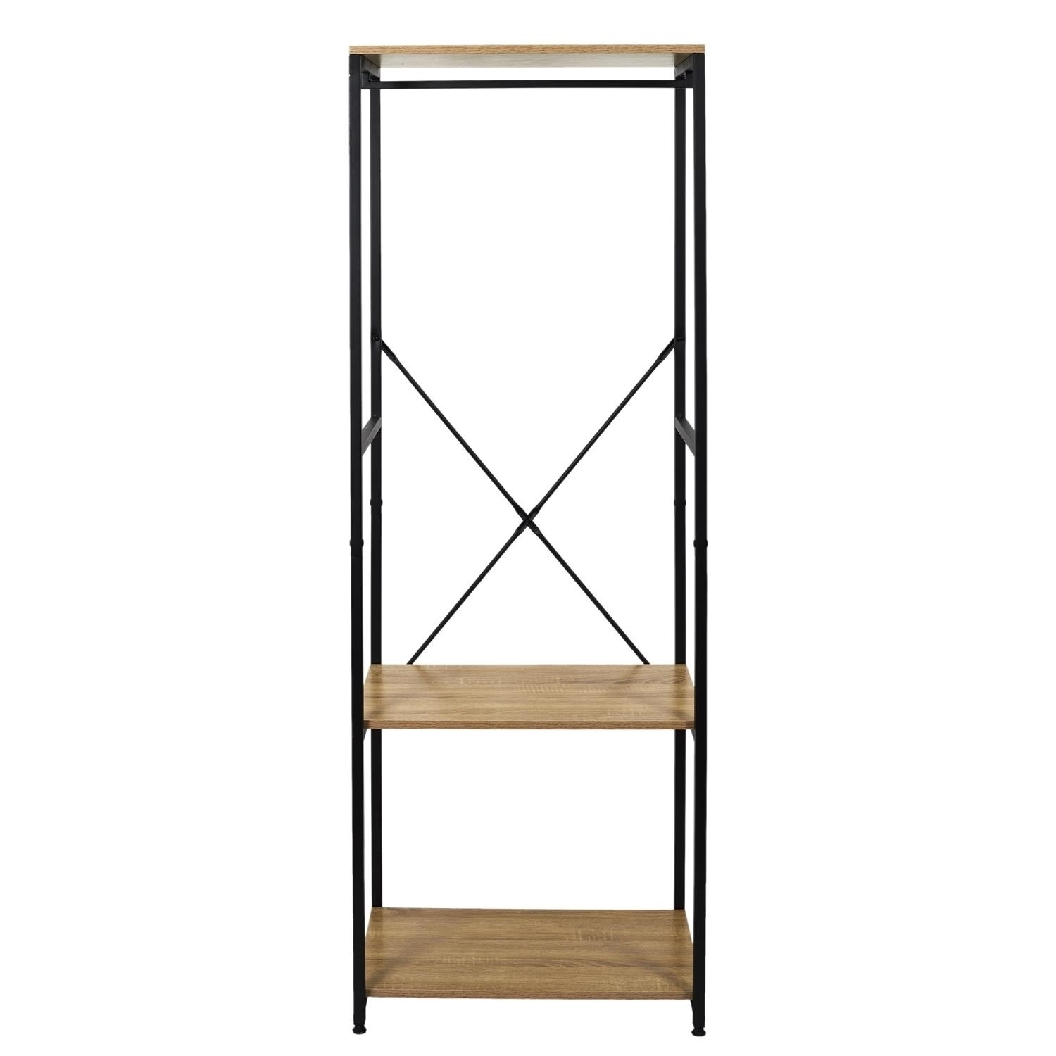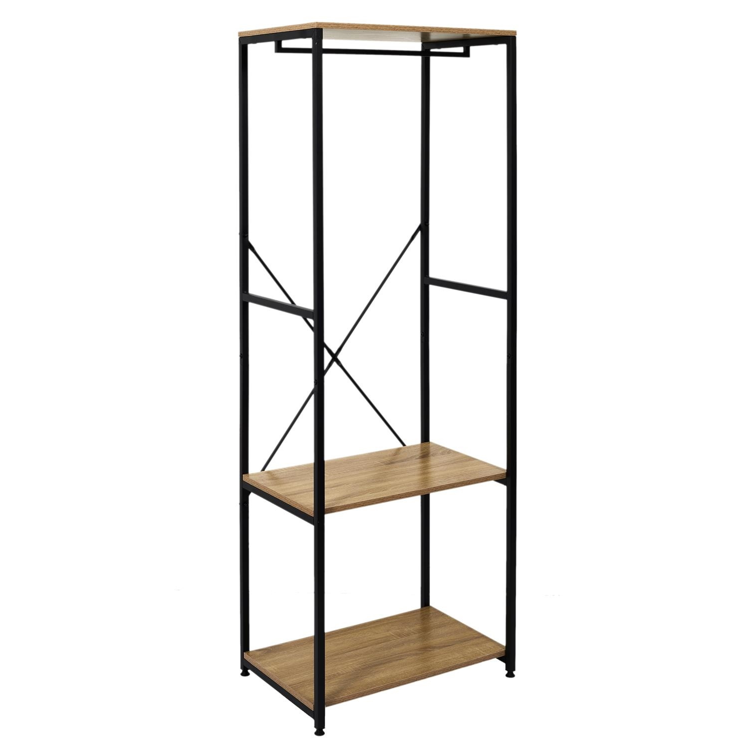 Garderoba Lukis to idealny mebel do przedpokoju lub do garderoby. Wieszak-garderoba Lukis to połączenie dwóch pojemnych półek oraz wieszaka. Całość zamknięta w efektownym szkielecie z metalu malowanego proszkowo oraz wykończona półkami z płyty MDF. Laminat imitujący drewno sprawdzi się we wnętrzu loftowym. Wymiar opakowania: 43x11x97 cmCechy produktu