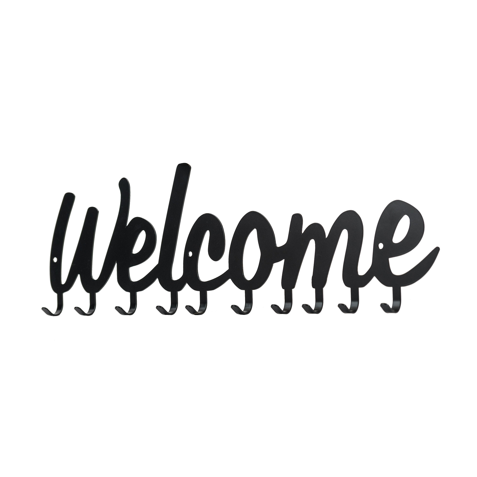 - Wieszak ścienny Welcome to nowoczesne rozwiązanie do przedpokoju, holu lub poczekalni. Jego precyzyjnie wycięty laserowo wzór, z napisem witającym gości, nada uroku każdemu wnętrzu. Stalowy malowany proszkowo wieszak jest uniwersalny oraz odporny na uszko