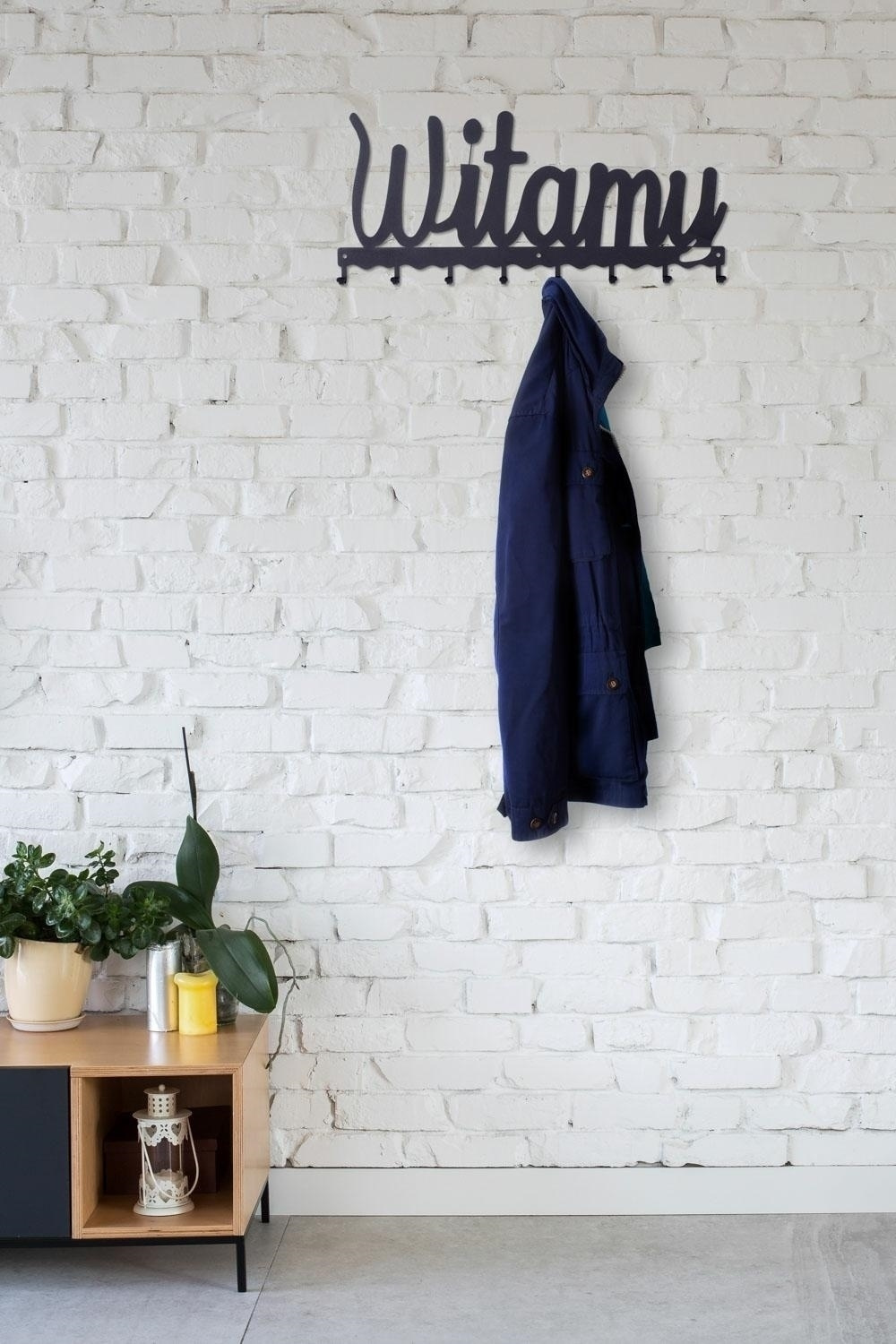 • Wieszak ścienny Witamy to nowoczesne rozwiązanie do przedpokoju, holu lub poczekalni. Jego precyzyjnie wycięty laserowo wzór, z napisem witającym gości, nada uroku każdemu wnętrzu. Stalowy malowany proszkowo wieszak jest uniwersalny oraz odporny na uszkod