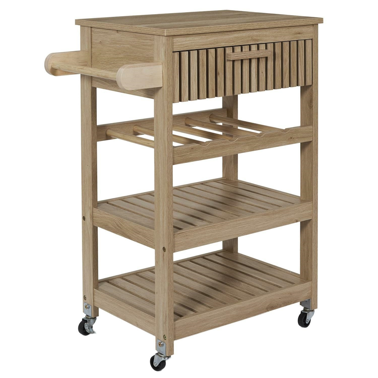 Wózek do serwowania Klaus to idealny przyjaciel każdej uporządkowanej pani domu. Wózek może byc pomocny w przenoszeniu potraw z kuchni do jadalni lub może posłyżyć jako dodtkowy blat i miejsce do przechowywania. Wózek wyposazony został w półkę na butleki wina oraz dwie półki na dowolne przedmioty. Dodatkowo pod blatem ukryta została szuflada z frontem w lamele. Wózek łatwo będzie przesuwać, trzymając za uchwy, który został przymocowany na bocznej ściance wózka. Cztery kółka z tworzywa gwarantuja łatwe przesuwanie wózka i skrę w każdą stronę. Wózek wymaga montażu. Waga wózka 15,3kg. Max. obciążenie wózka 25kg Materiał: płyta MDF, płyta wiórowa, tworzywo sztuczne (kółka)Cechy produktu
