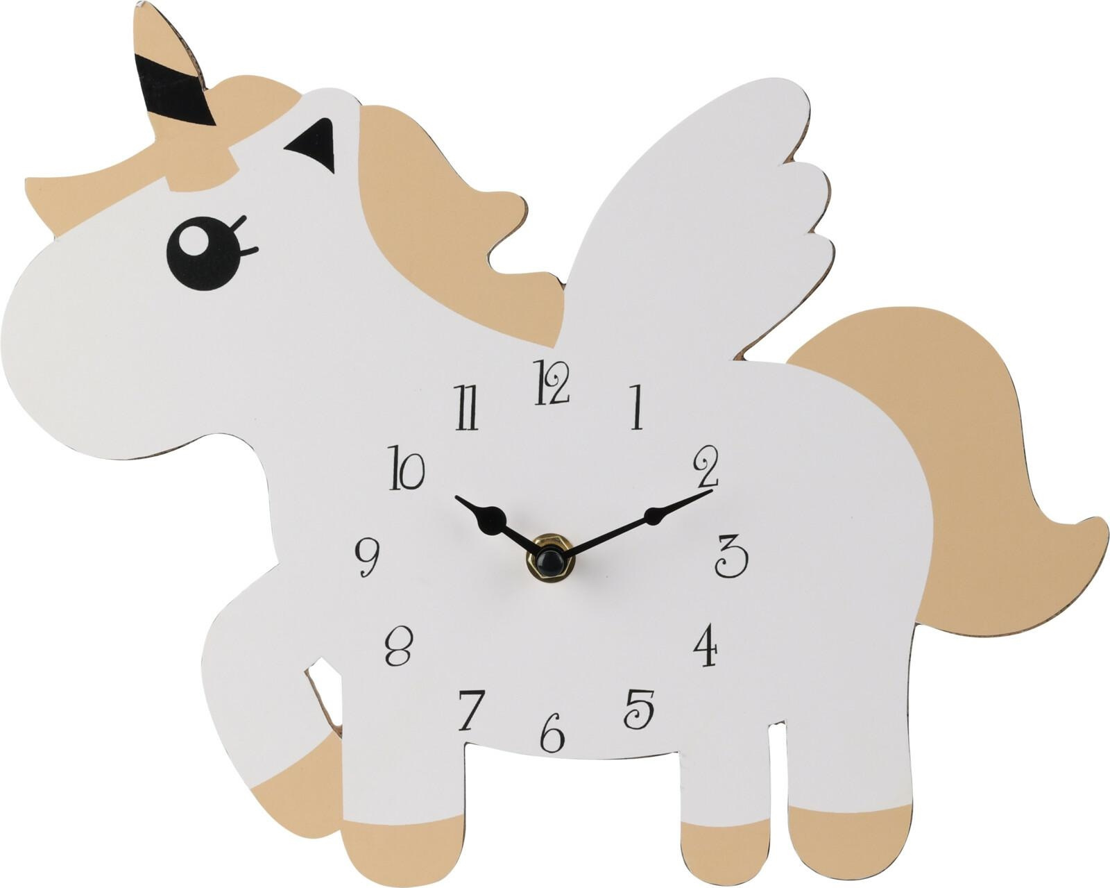 - Zegarek naścienny w kształcie jednorożca. Działa na jedną baterię AA (brak w zestawie). Do pokoju dziecięcego lub np sali przedszkolnej. Materiał MDF. Wymiary opakowania: 31x4,5x25,5cm