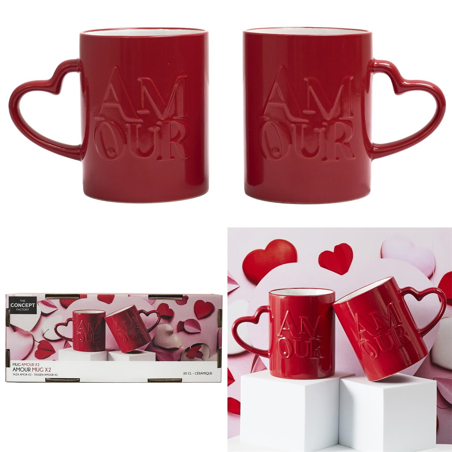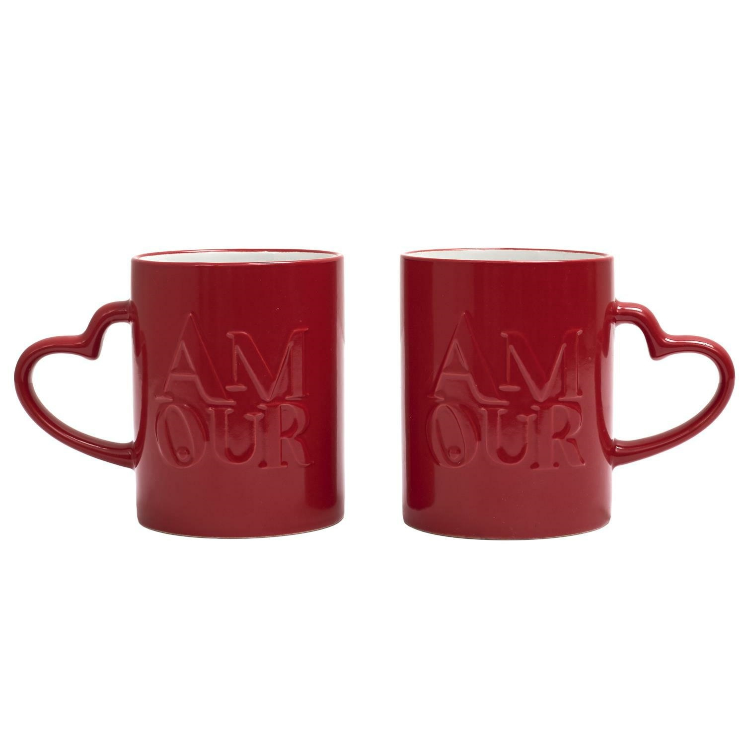 Romantyczny zestaw dwóch kubków z uchem w kształcie serca to must have tegorocznych walentynek lub rocznicy ślubu! Zestawk dwóch kubków z napisem Amour doda pikanterii podczas wieczornej gorącej herbaty we dwoje. Kubki o pojemności 300ml są zestawem, któy pasuje do siebie tworząc idealny dodatek na domową randkę we dwoje. Kubki wykonane z ceramiki. Można je myć w zmywarce. Można używać w mikrofalówce.Cechy produktu