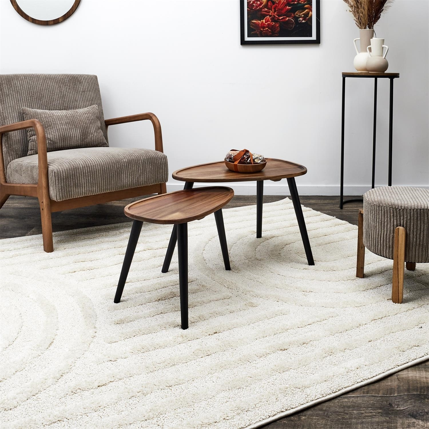 Zestaw dwóch drewnianych stolików kawowych Noby sprawdzi się zarówno w dużym jak i małym salonie. Stoliki wykonane z drewna akacji jako blat oraz drewna sosnowego jako nogi są w 100% wykonane z naturalnych materiałów. Stoliki można zestawić ze sobą, można postawić jeden pod drugim, albo postawić je całkowicie oddzielnie. Stoliki wymagają montażu. Max. obciążenie na jeden stolik 15kgCechy produktu