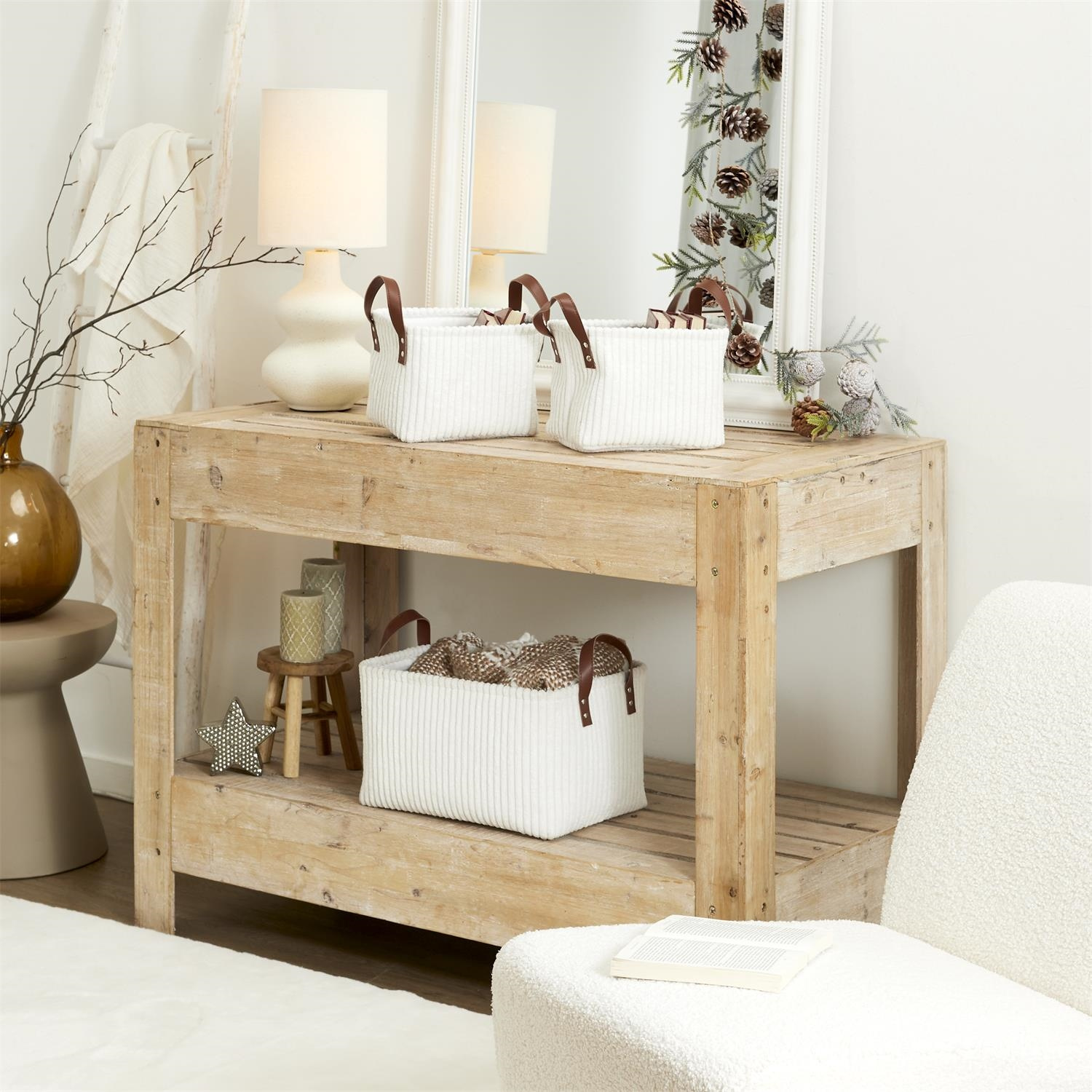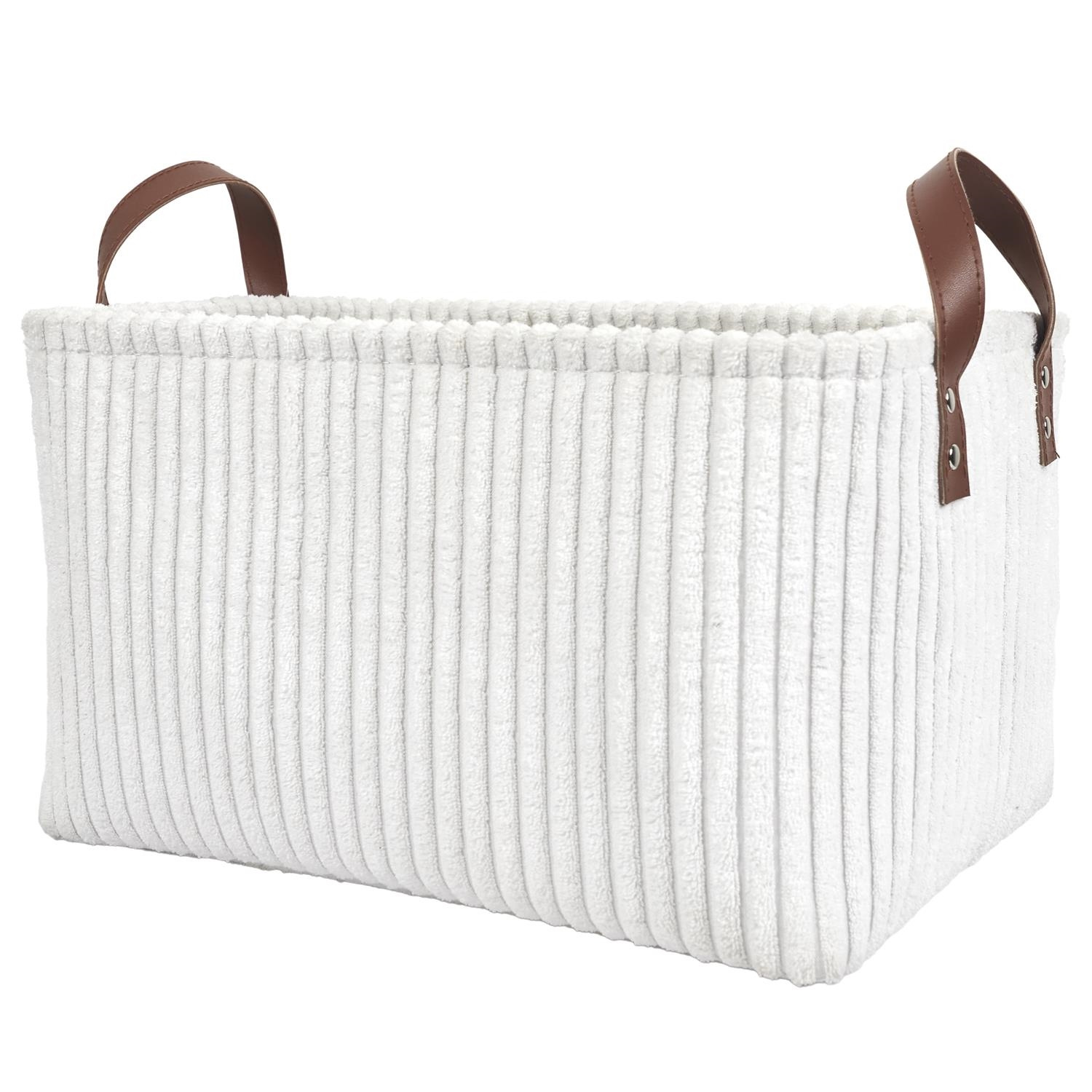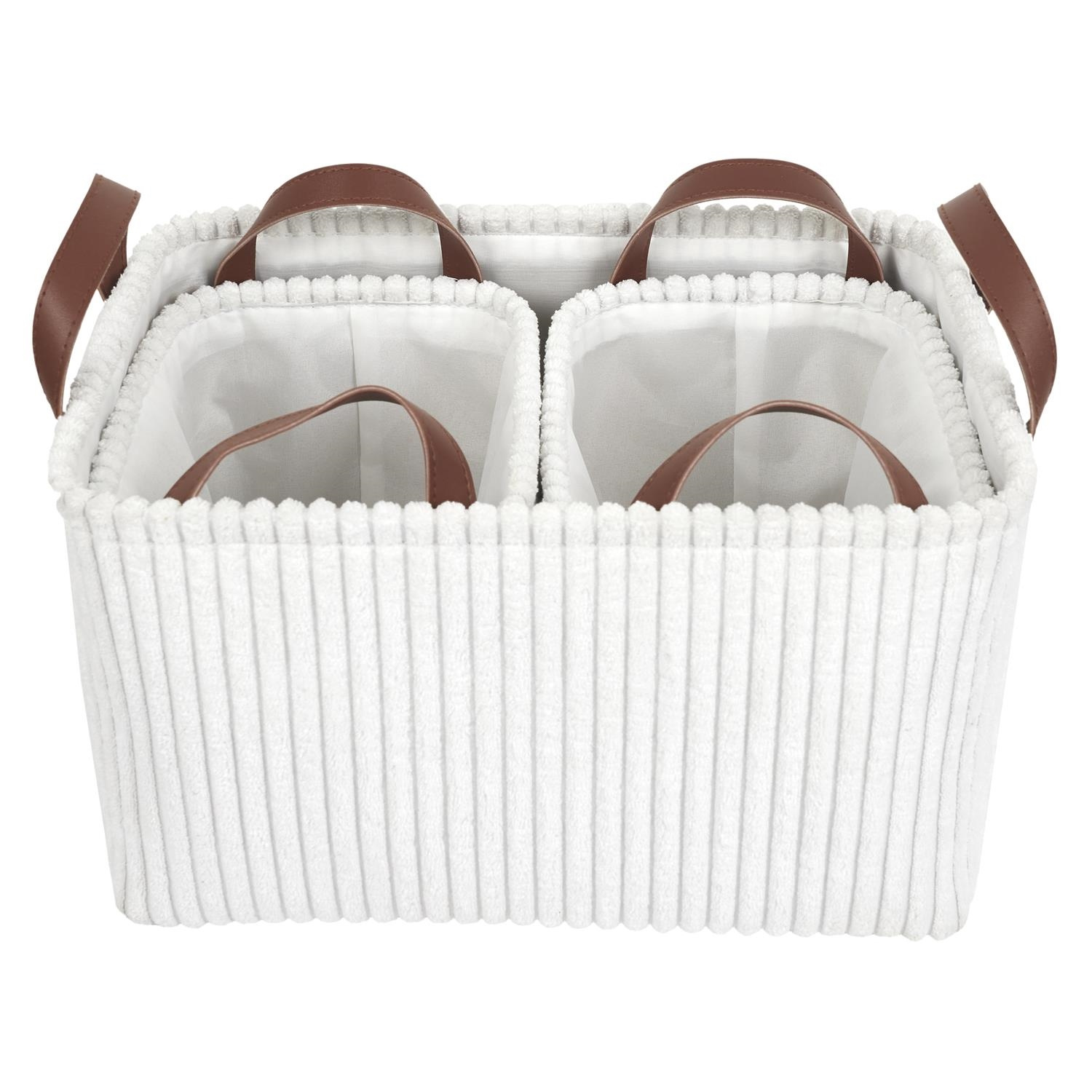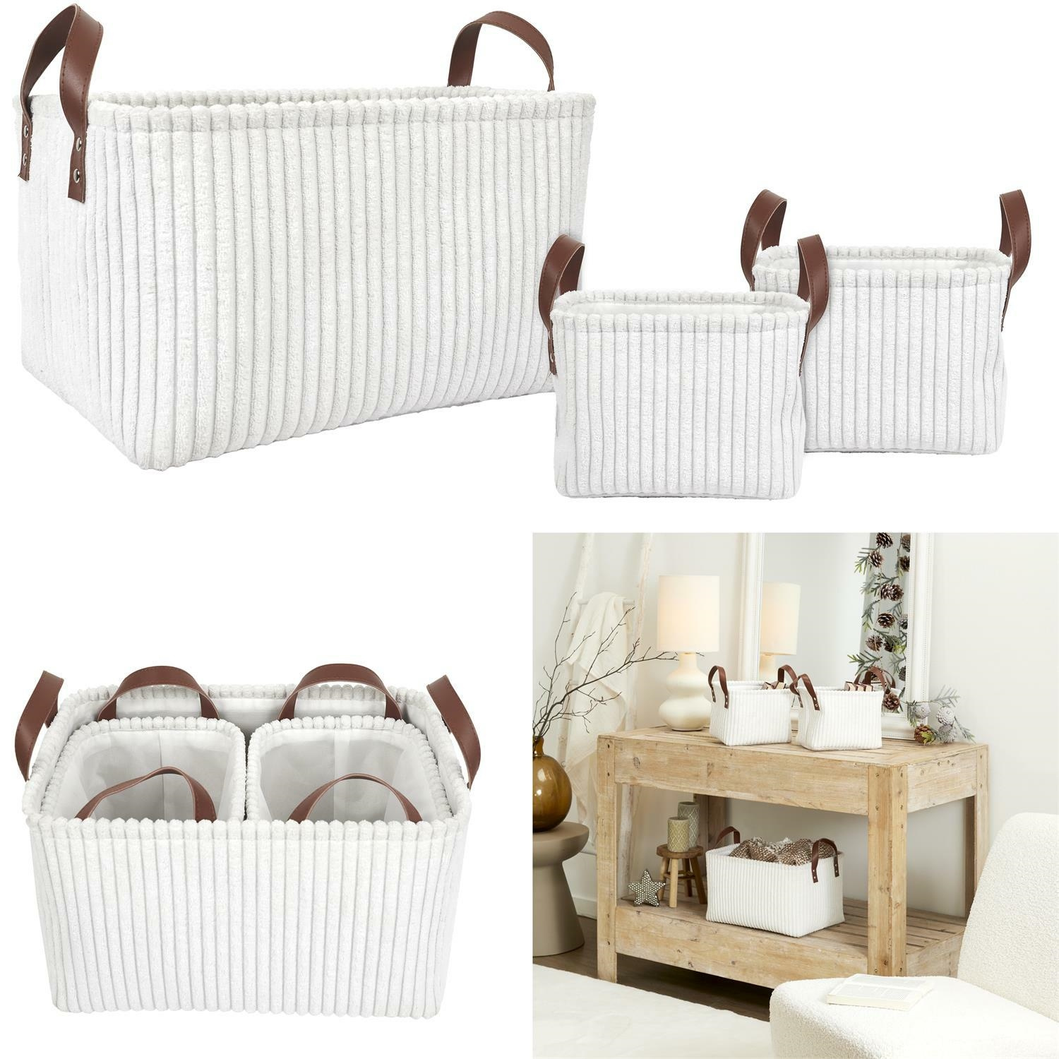 Zestaw 3 koszy w tkaninie sztruksowej to idealna dekoracja jak i element do organizacji rpzestrzeni. Wymiary duzego kosza: 20x36x26cm i dwa mniejsze o wymiarze 16x24x19cmCechy produktu