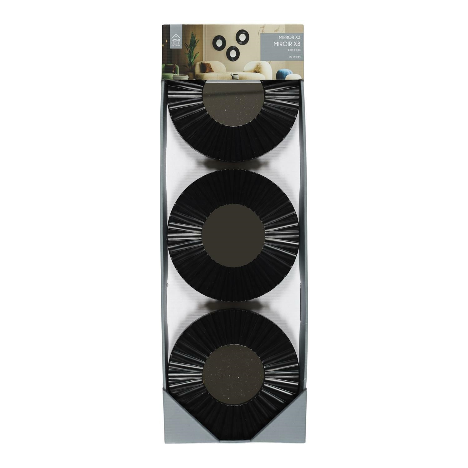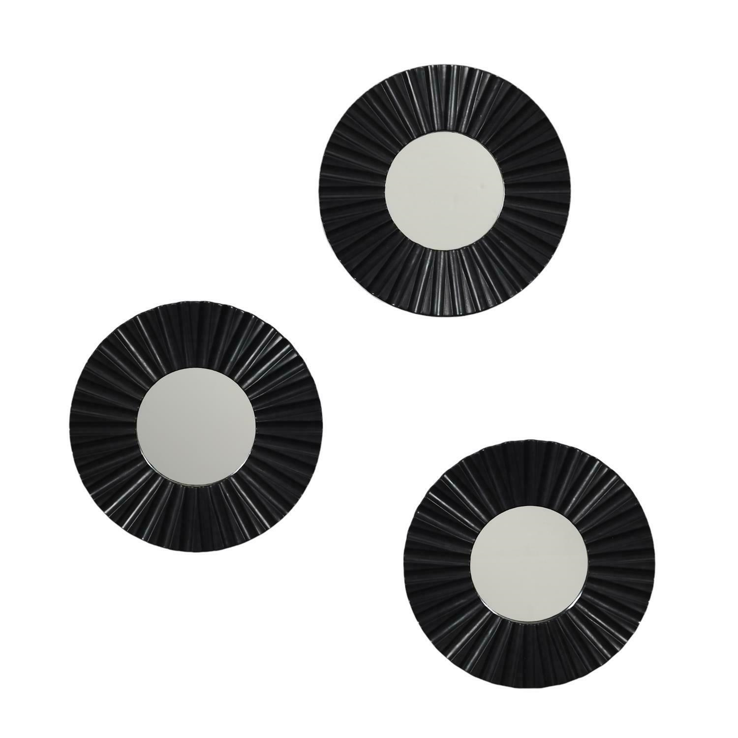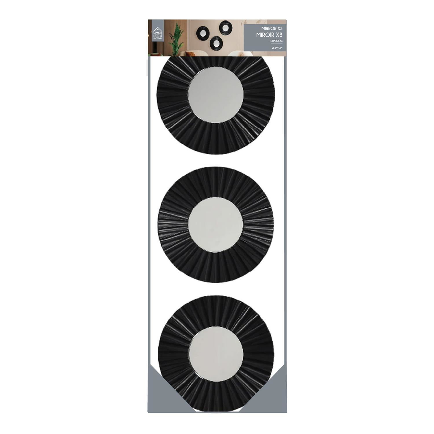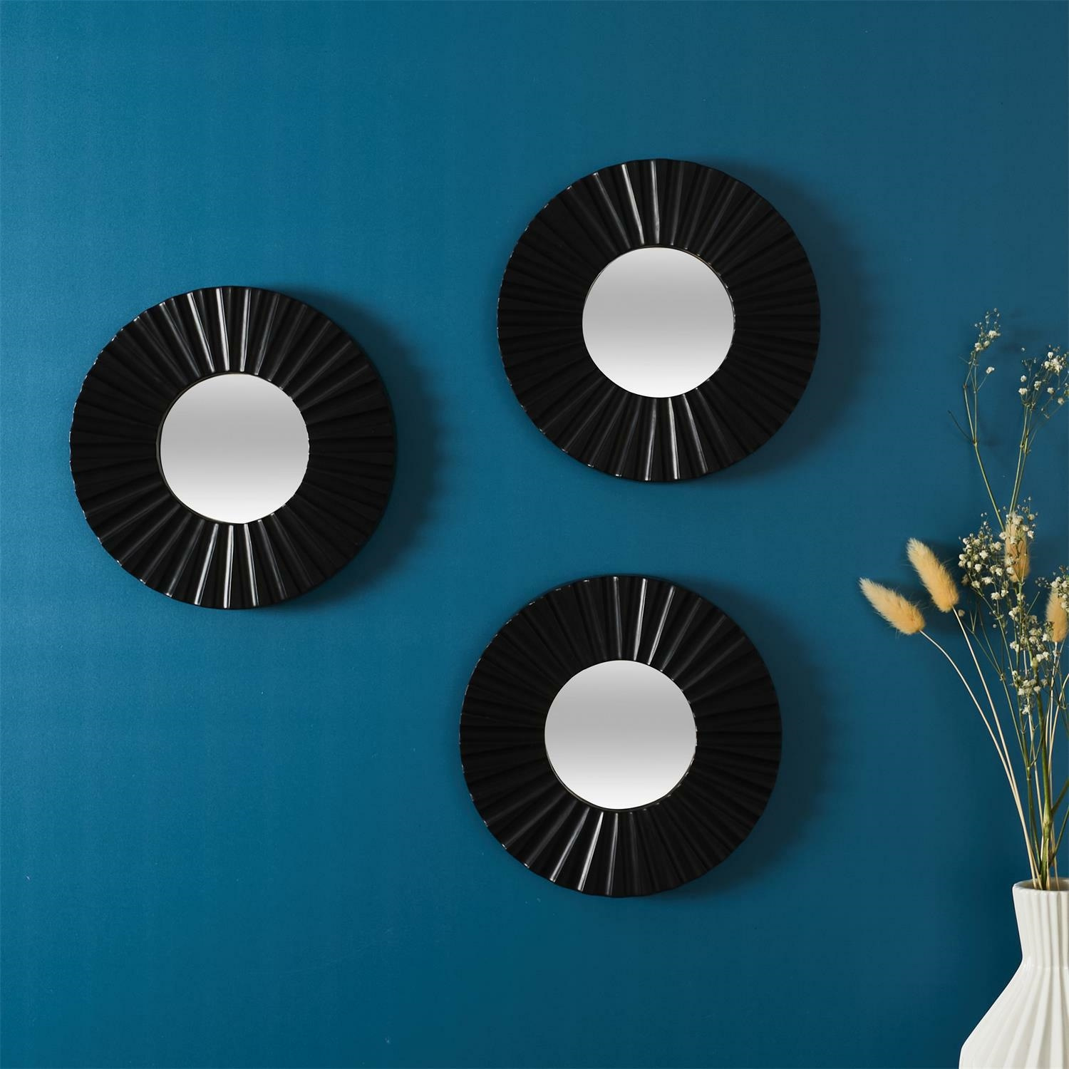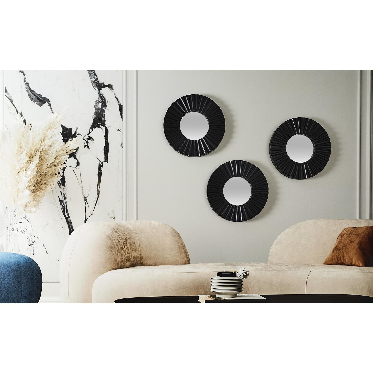 Zestaw 3 luster o średnicy 19cm t idealna ozdoba ściany salonu, sypialni lub przedpokoju. Lustra o ciekawym, harmonijkowym kształcie dodają głębi pomieszczeniu. zestaw 3 luster idealnie będzie komponowac się z kwiatami oraz zegarem w stylu japandi. Zwierciadło luster wykonane ze szkła, natomiast rama to tworzywo sztuczne. Średnica zwierciadła to 10cm.Cechy produktu
